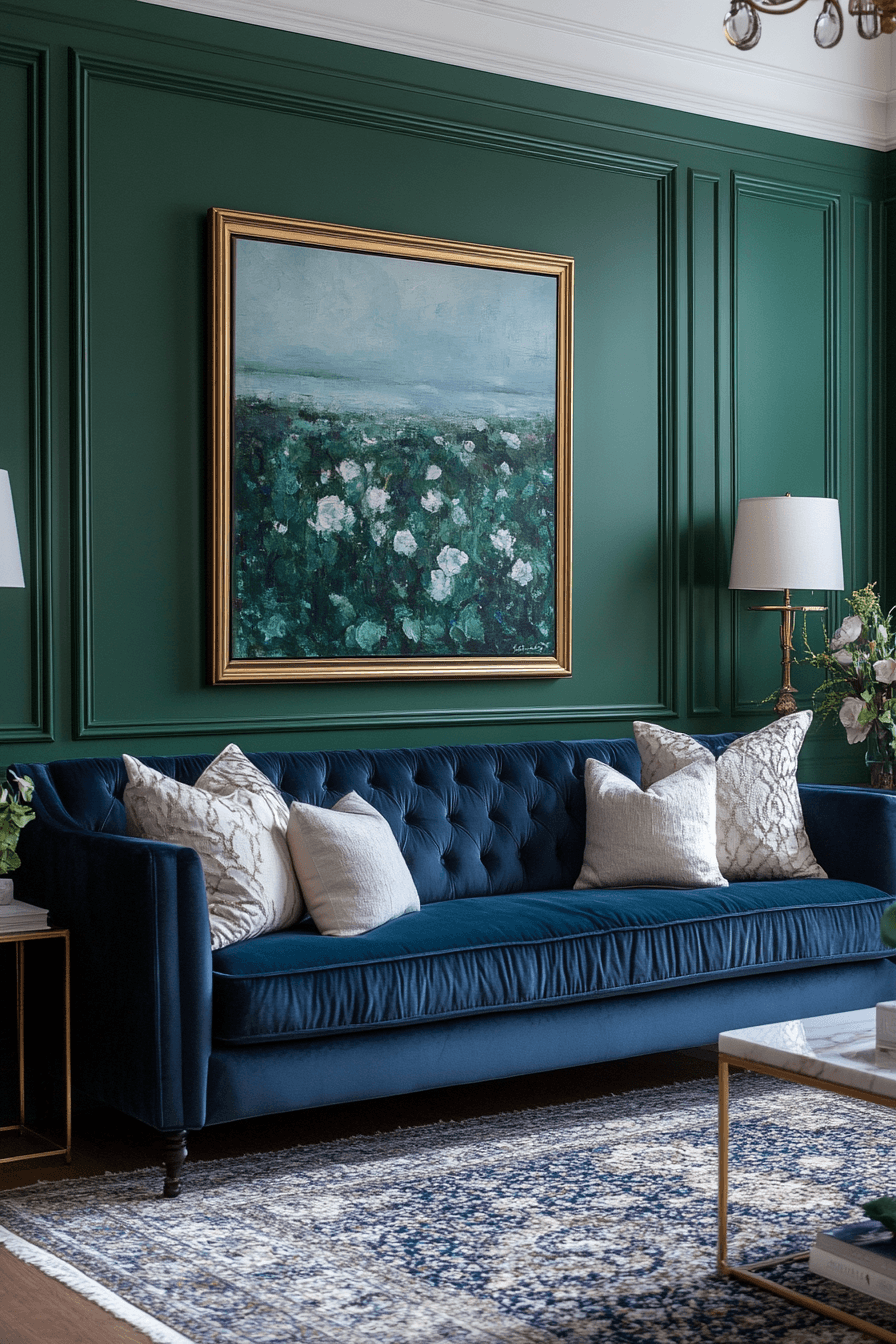 Deep saturated hues define a luxurious jewel tone living room filled with dramatic elegance. Emerald walls and navy sofas create a powerful color combination. Velvet and silk textures elevate the sense of richness. Gold-framed art adds visual interest and refinement. Soft lighting keeps the space warm and inviting. Click to see more deep jewel tone living room inspiration.