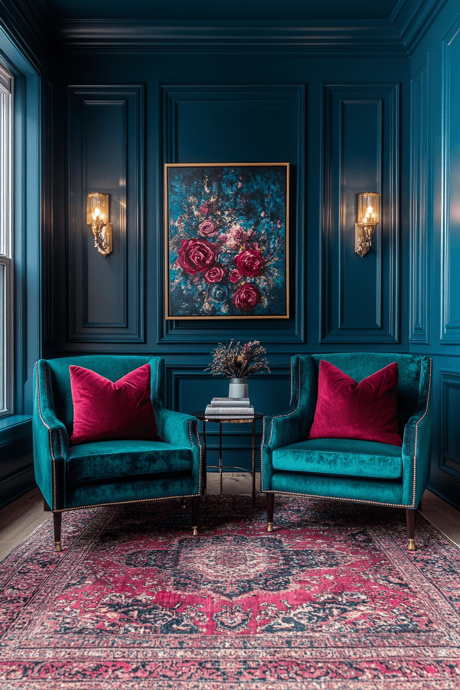 A jewel tone living room designed with vivid color layering feels energetic and luxurious. Emerald chairs paired with sapphire walls create striking contrast. Plush fabrics and shimmering accessories elevate the design. Multiple jewel hues build a dynamic and multidimensional look. Warm lighting enhances the richness of the palette. Click to discover vivid jewel tone living room inspiration.