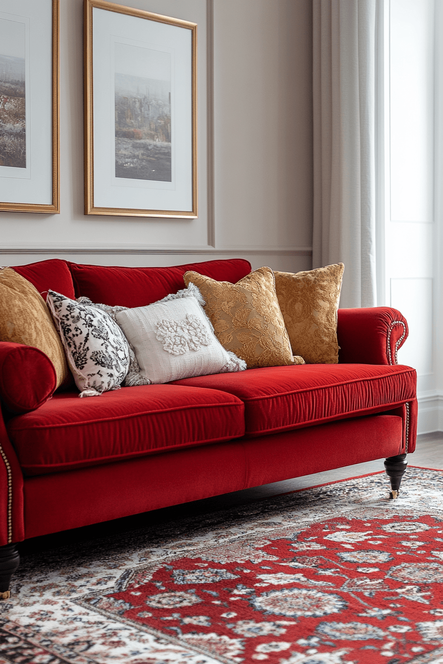 Ruby red seating introduces warmth and passion to a stylish jewel tone living room. The rich color makes an immediate statement. Gold accents enhance the luxurious atmosphere. Soft neutral walls help balance the bold hue. Plush rugs add comfort while maintaining elegance. Click to see more ruby-inspired jewel tone living room ideas.