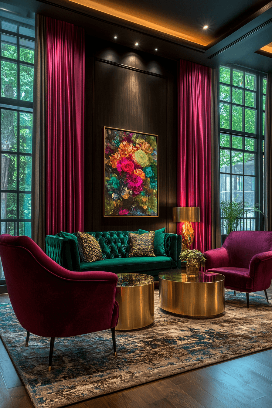 Bold color paired with reflective surfaces creates stunning brilliance in a jewel tone living room. Mirrors and metallic decor amplify light while highlighting the jewel shades. Rich textures add depth and warmth throughout the space. Polished surfaces keep the look glamorous. The result feels vibrant and inviting. Tap to discover more jewel tone living room brilliance.