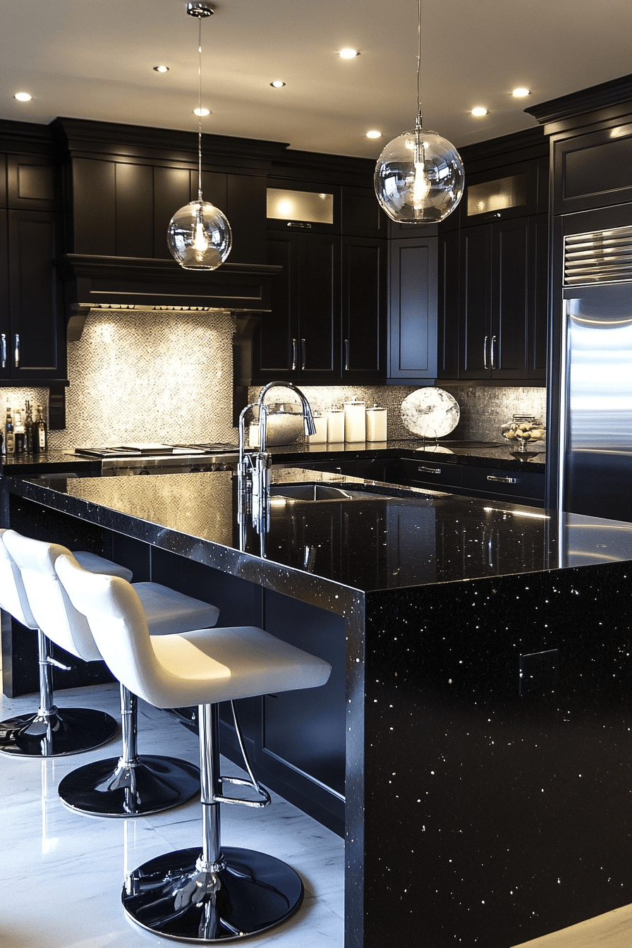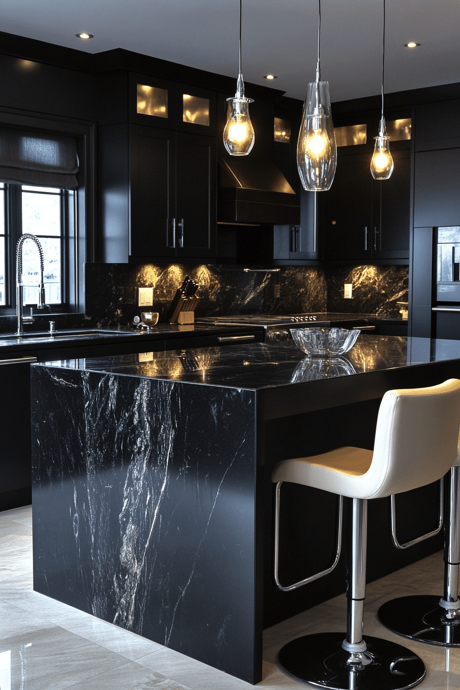 Deep-toned stone elements create a luxury kitchen that feels bold, dramatic, and sophisticated. Dark cabinetry and countertops introduce contrast and depth. Metallic accents enhance the modern edge of the design. Soft lighting ensures the space remains inviting and warm. Comfortable seating adds both function and style. Uncover more luxury kitchen ideas that embrace bold elegance.