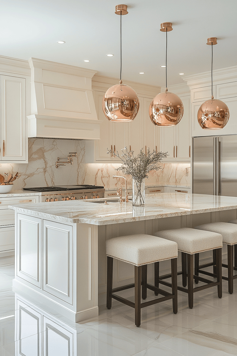 Rose-toned metallic accents bring softness and elegance into a luxury kitchen with a romantic edge. Subtle shimmer enhances neutral cabinetry beautifully. Marble countertops add refinement and balance. Plush seating introduces comfort and warmth. Pendant lighting highlights the delicate metallic tones. Discover more luxury kitchen ideas with a romantic, refined touch.