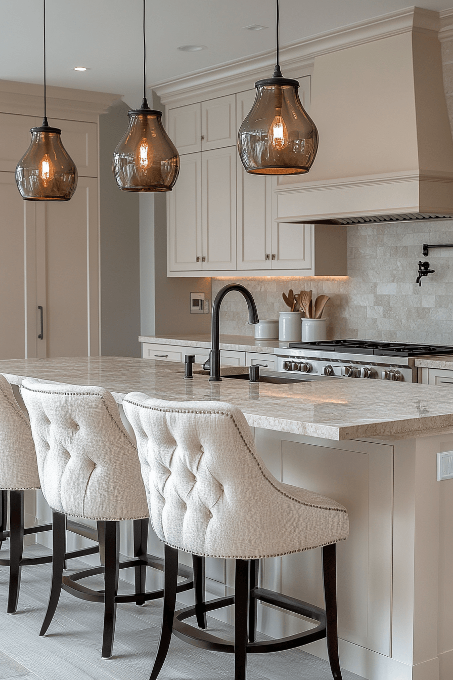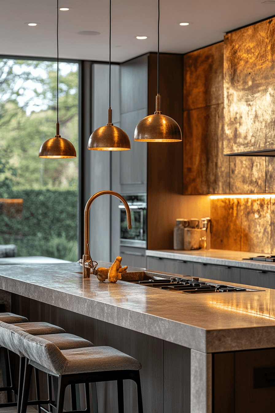 Bronze finishes add depth and understated luxury into a kitchen design filled with warmth. Metallic accents introduce subtle shine without overpowering the palette. Neutral cabinetry maintains cohesion and balance. Comfortable seating enhances the inviting feel. Warm lighting highlights the bronze tones beautifully. Explore more luxury kitchen ideas with rich metallic detail.