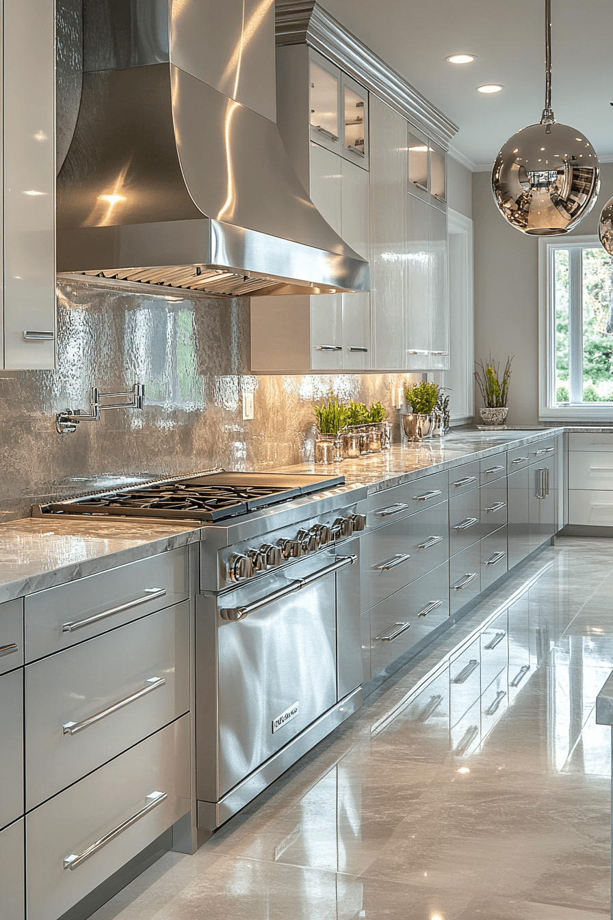 Cool metallic finishes shape a luxury kitchen with sleek, modern appeal. Silver accents reflect light across cabinetry and fixtures. Neutral tones maintain a clean and cohesive look. Soft lighting enhances the reflective surfaces. Comfortable textures balance the polished design. Get inspired by more luxury kitchen ideas with contemporary metallic tones.