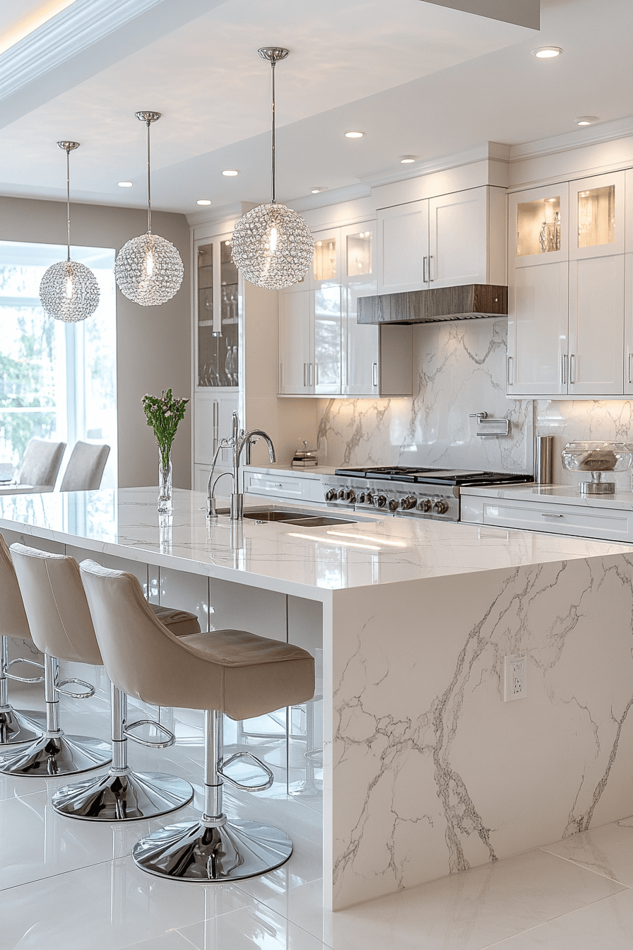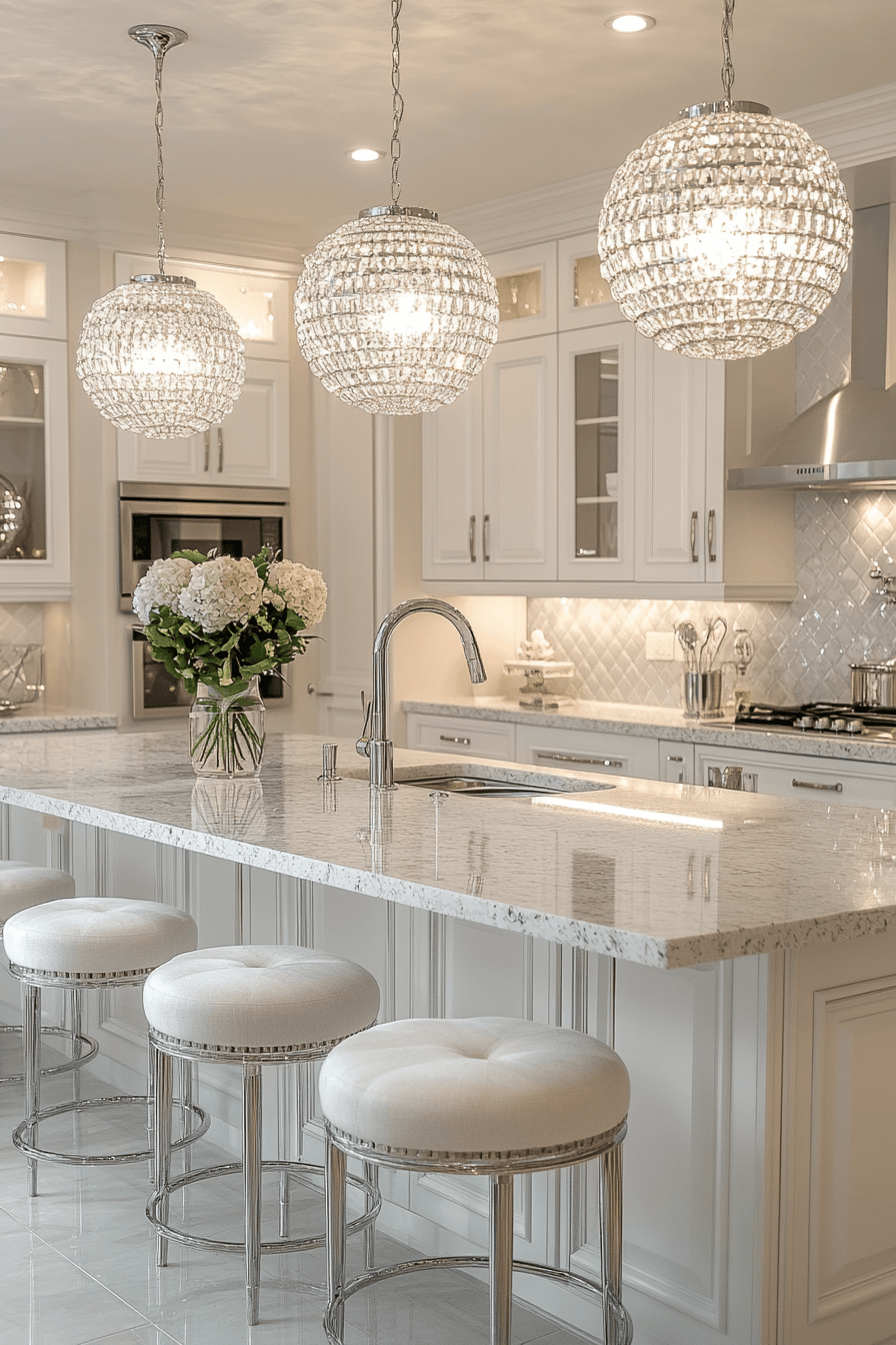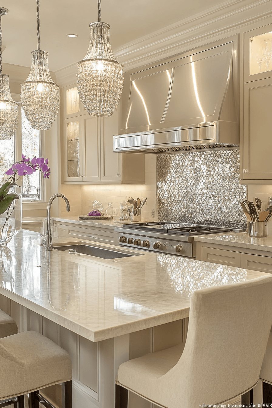 Reflective finishes bring a luminous quality into a luxury kitchen that feels bright and polished. Crystal lighting enhances sparkle across surfaces. White cabinetry keeps the space fresh and open. Metallic accents amplify the glow without overpowering the design. Neutral flooring balances the overall palette. Discover more luxury kitchen ideas that shine with sophistication.