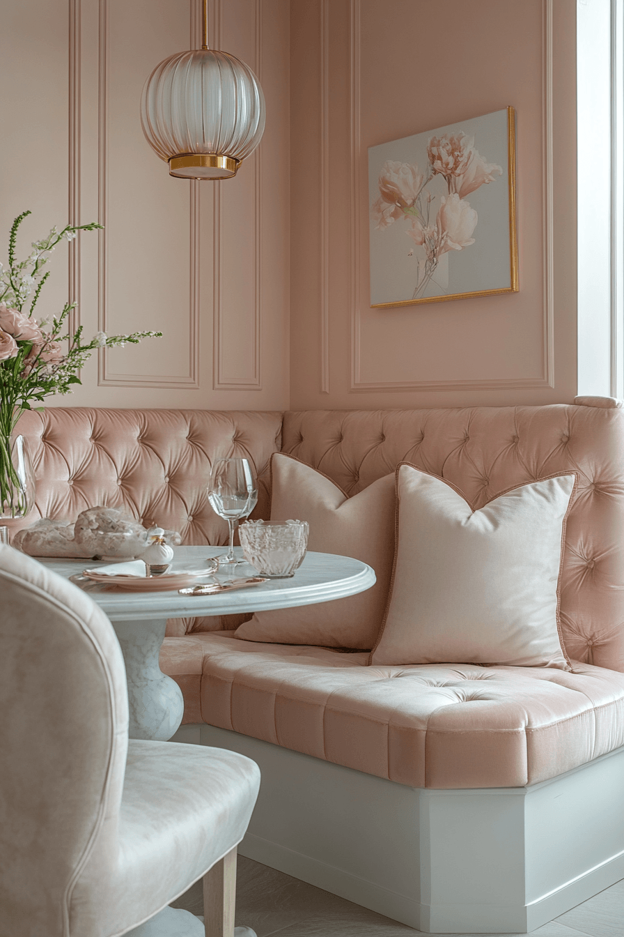 Blush accents introduce warmth and softness into a luxury kitchen with a refined aesthetic. Gentle tones brighten the space while maintaining elegance. Neutral cabinetry keeps the palette balanced. Plush seating enhances comfort and style. Metallic finishes add a polished touch. Find more luxury kitchen ideas with soft, warm tones.