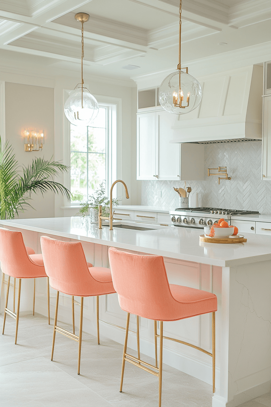 Coral accents bring energy and vibrancy into a luxury kitchen with a playful yet refined feel. Bright tones contrast beautifully with neutral cabinetry. Metallic finishes add sophistication to the palette. Comfortable seating enhances the welcoming atmosphere. Balanced lighting keeps the design cohesive. Explore more luxury kitchen ideas with lively color accents.