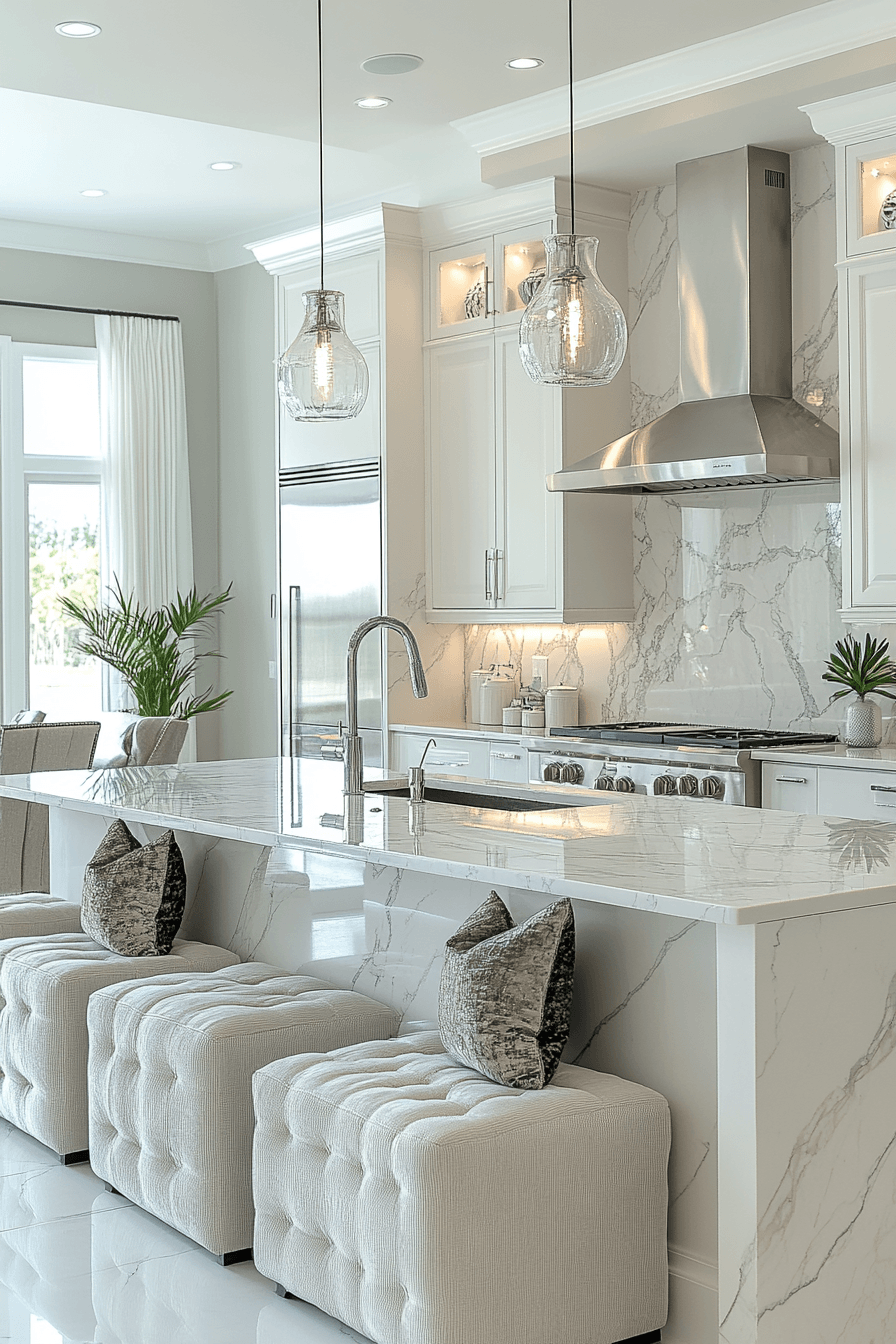 Crisp white finishes shape a luxury kitchen that feels bright, fresh, and timeless. Clean cabinetry enhances openness and clarity. Metallic accents add subtle refinement. Plush seating softens the overall design. Natural light amplifies the airy feel. Explore more luxury kitchen ideas with clean white elegance.
