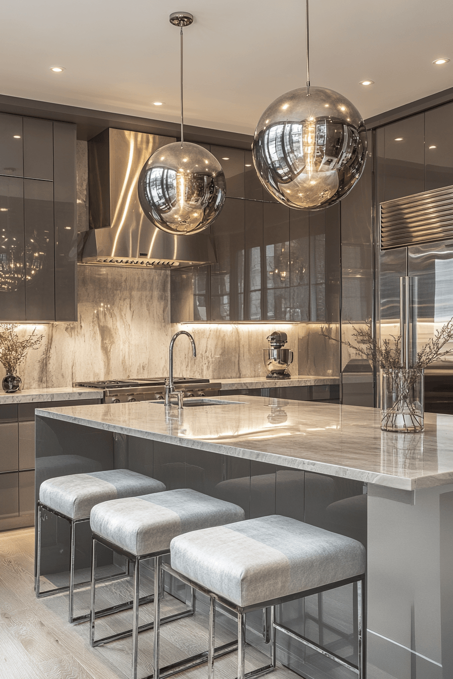 Polished metallic finishes define a luxury kitchen with sleek, modern sophistication. Platinum tones create a clean and contemporary foundation. Stone countertops soften the reflective elements for balance. Layered lighting adds depth and vibrancy. Minimal furnishings keep the design uncluttered and refined. See more luxury kitchen ideas that highlight modern metallic elegance.
