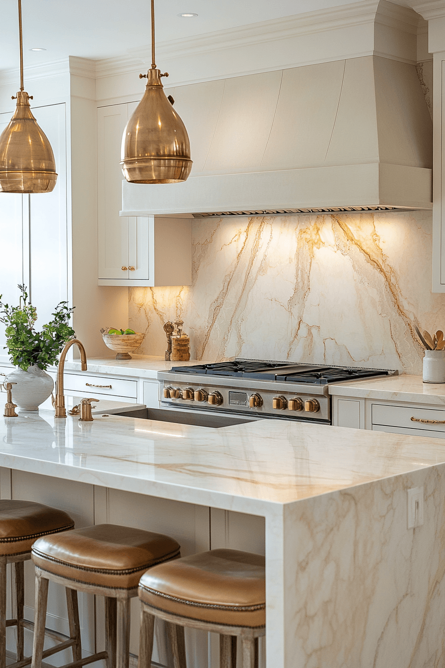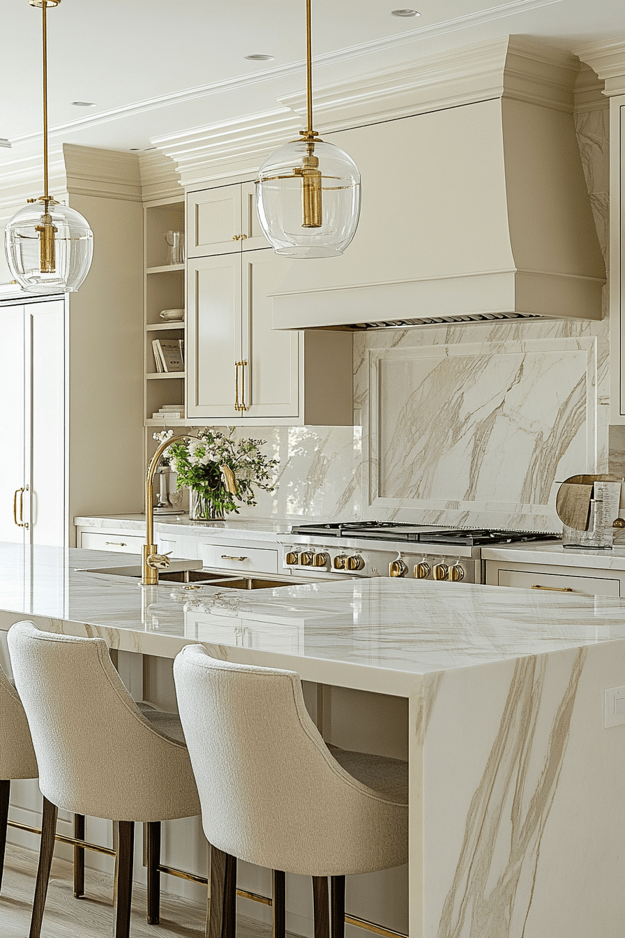 Warm marble tones create a luxury kitchen that feels inviting and naturally elegant. Subtle veining adds depth and character to the space. Neutral cabinetry balances the richness of the stone. Comfortable seating enhances coziness. Lighting highlights the marble’s natural beauty. Explore more luxury kitchen ideas with warm stone finishes.
