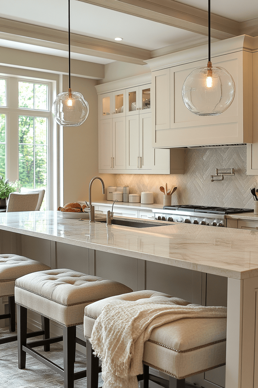 Ivory tones shape a luxury kitchen that feels calm, cohesive, and timeless. Soft cabinetry establishes a warm and inviting base. Subtle metallic accents add refinement without excess. Comfortable seating enhances the welcoming feel. Under-cabinet lighting highlights the soft tones beautifully. Browse more luxury kitchen ideas that embrace serene elegance.