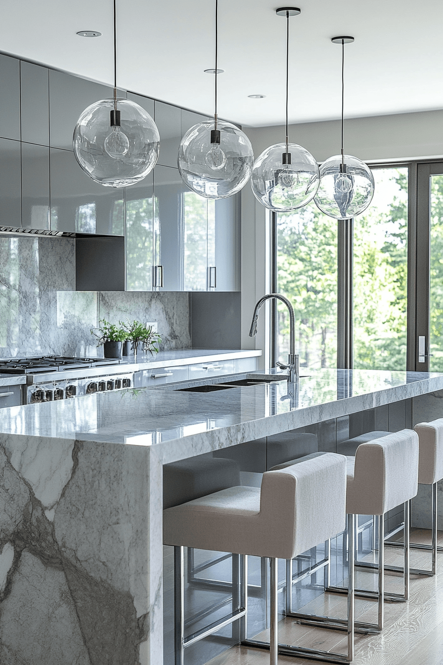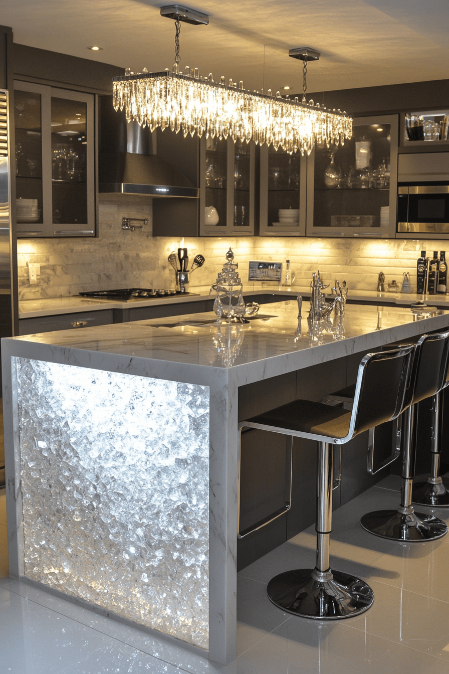 Crystal-inspired island designs bring brilliance into a luxury kitchen with a striking focal point. Reflective surfaces scatter light beautifully across the space. Sleek cabinetry and polished countertops create a seamless aesthetic. Pendant lighting adds warmth while highlighting the island’s details. Neutral tones keep the design balanced and sophisticated. Find more luxury kitchen inspirations centered around statement islands.