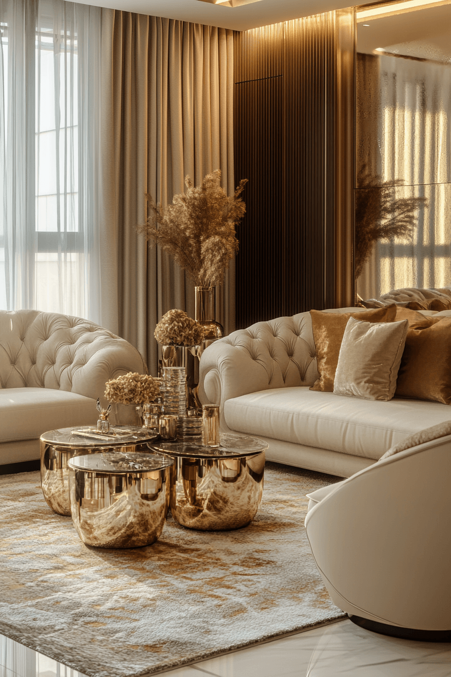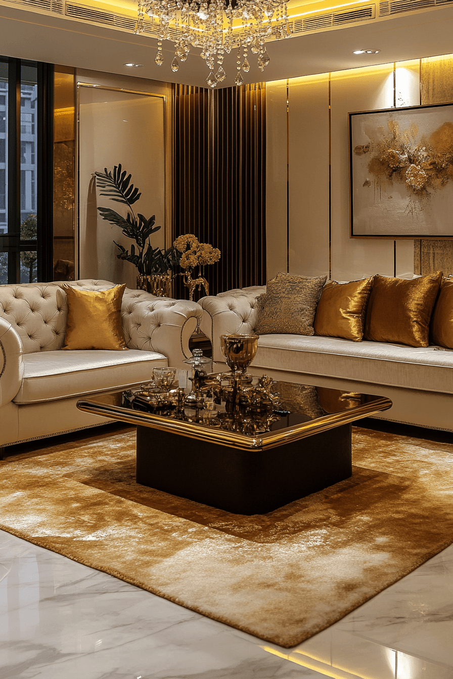 Shimmering gold details create a luxury living room design that feels radiant and timeless. Metallic accents draw attention without overwhelming the space. Neutral furniture provides a calm and balanced base. Rich fabrics add layers of comfort and depth. Warm lighting enhances the golden tones throughout. Elevate your living room with glowing elegance today.
