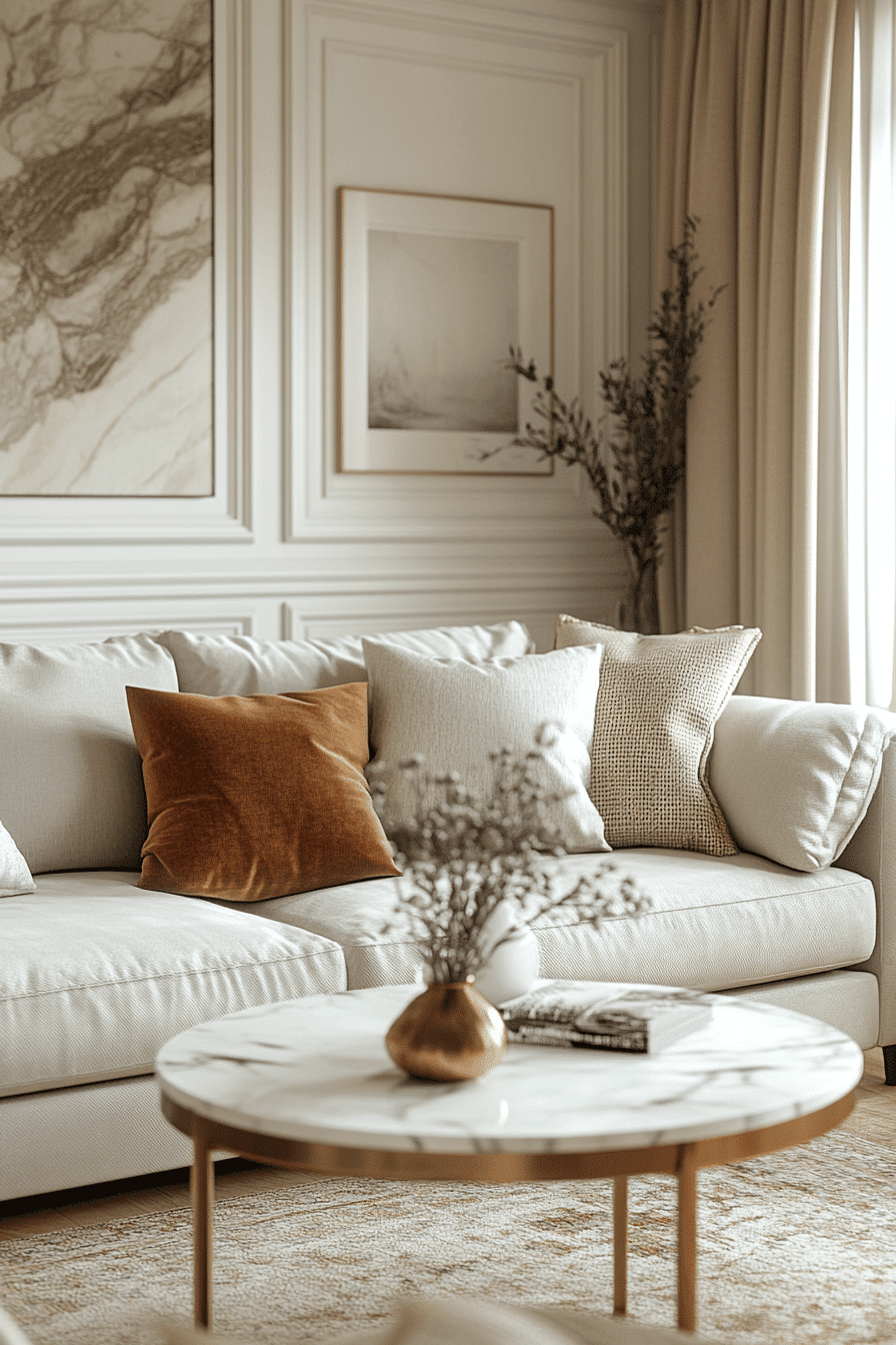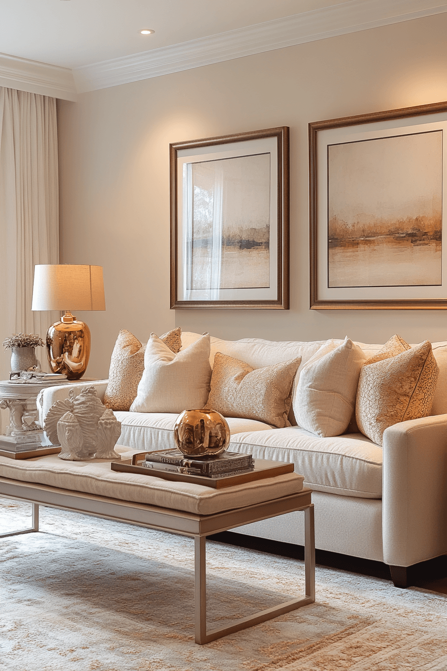 Bronze accents add warmth and understated glamour to a luxury living room design. Metallic finishes shimmer subtly throughout the space. Neutral furniture maintains balance and cohesion. Plush fabrics soften the look and add comfort. Warm lighting enhances the bronze tones beautifully. Add a refined glow to your living room today.