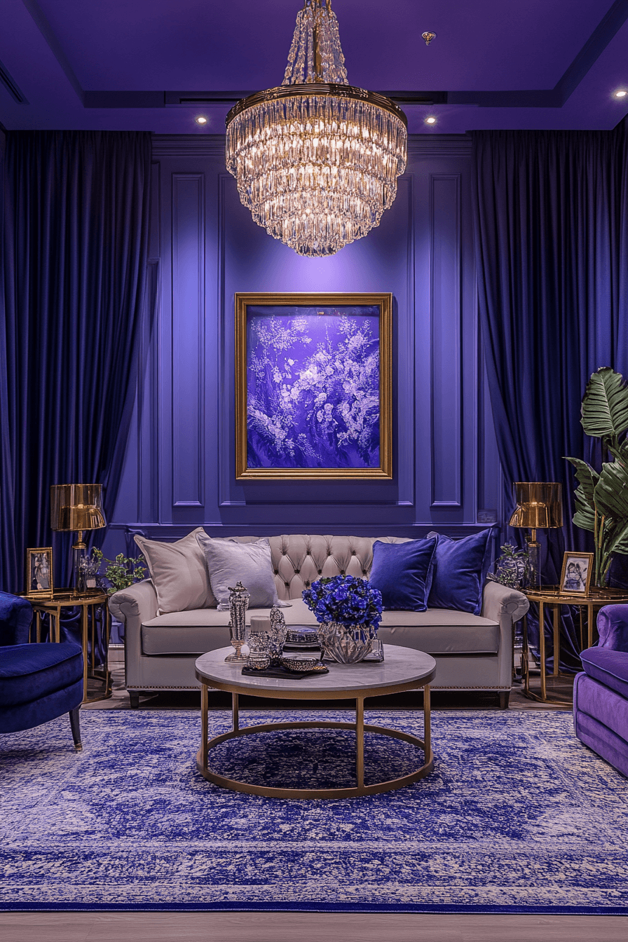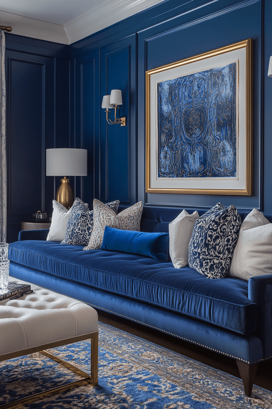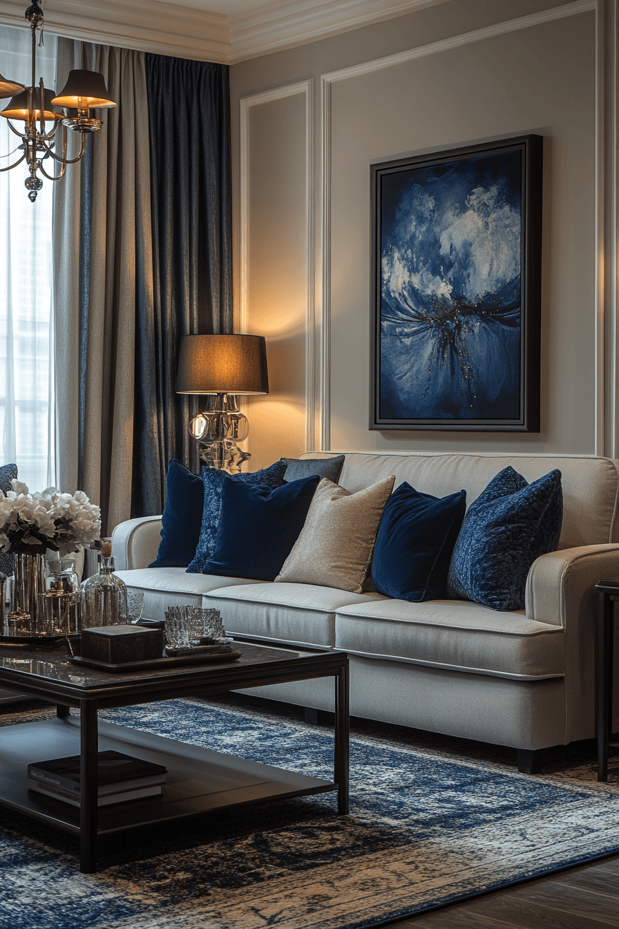 Bold cobalt accents energize a luxury living room design with vibrant sophistication. Deep hues create visual impact while neutral elements maintain balance. Metallic décor introduces a polished finish. Plush textures ensure the space remains comfortable and inviting. Warm lighting softens the bold palette beautifully. Add a vibrant yet elegant touch to your living room now.
