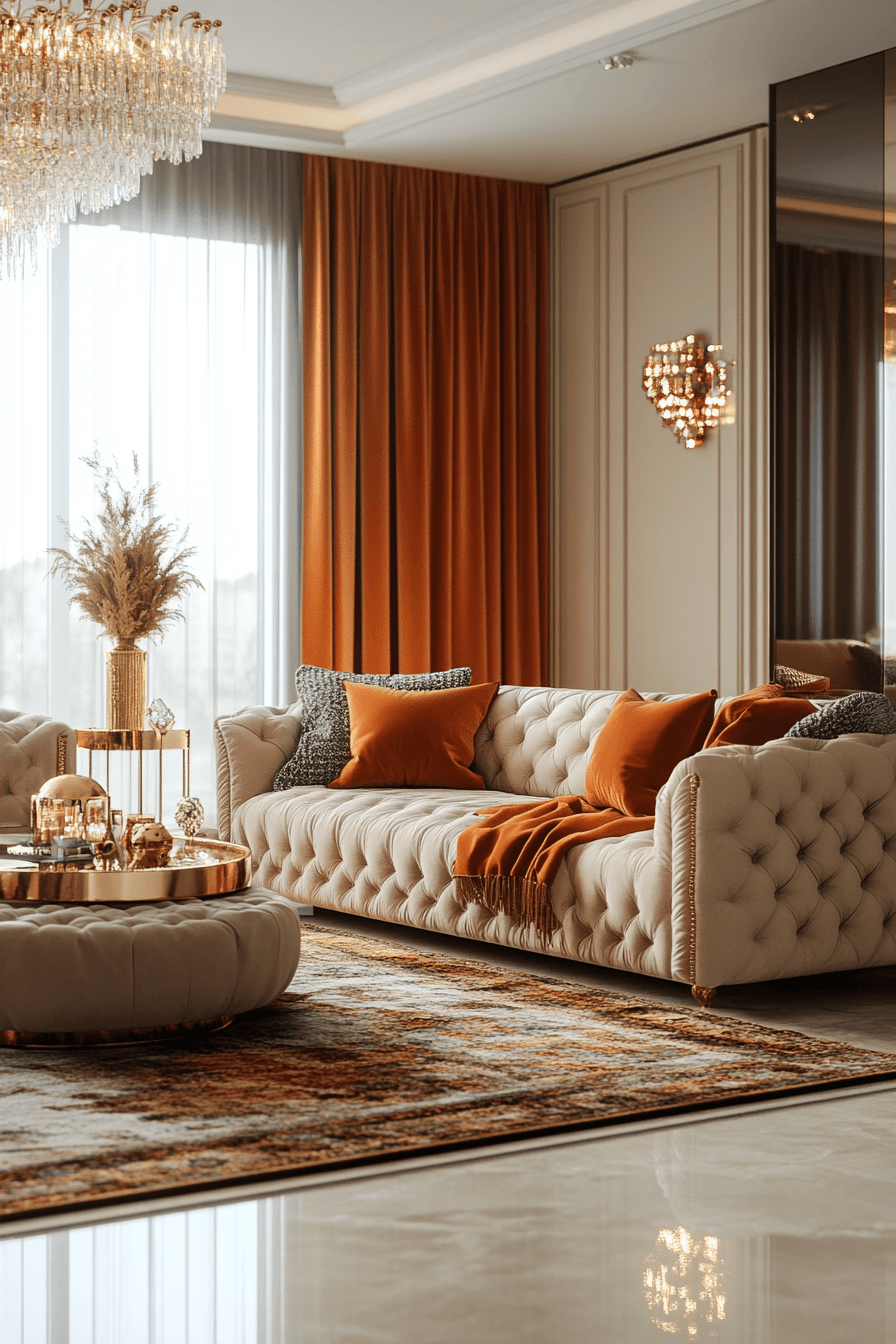 Warm amber tones infuse a luxury living room design with energy and inviting charm. Rich hues across textiles create depth and vibrancy. Neutral seating keeps the palette grounded and refined. Metallic accents enhance the warmth of the design. Layered lighting creates a glowing and cozy ambiance. Bring warmth and elegance into your living space now.