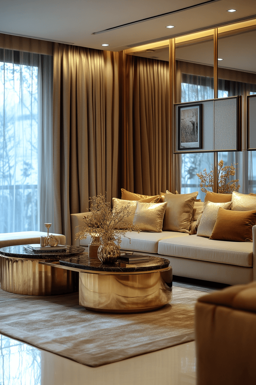 Golden accents instantly elevate a luxury living room design into a space that feels radiant and welcoming. Subtle metallic finishes across décor and furniture introduce a soft shimmer without overwhelming the room. Neutral sofas layered with velvet and silk cushions create balance between comfort and sophistication. Light-toned flooring or plush rugs ground the palette while allowing gold elements to stand out. Warm statement lighting enhances the glow, creating a cozy yet refined atmosphere. Discover how to bring this golden elegance into your living room today.