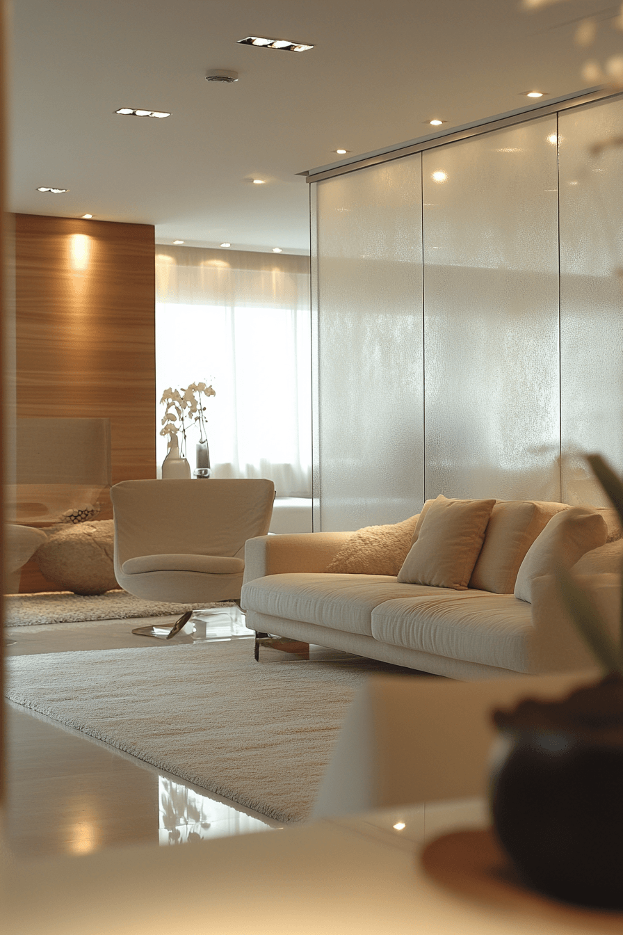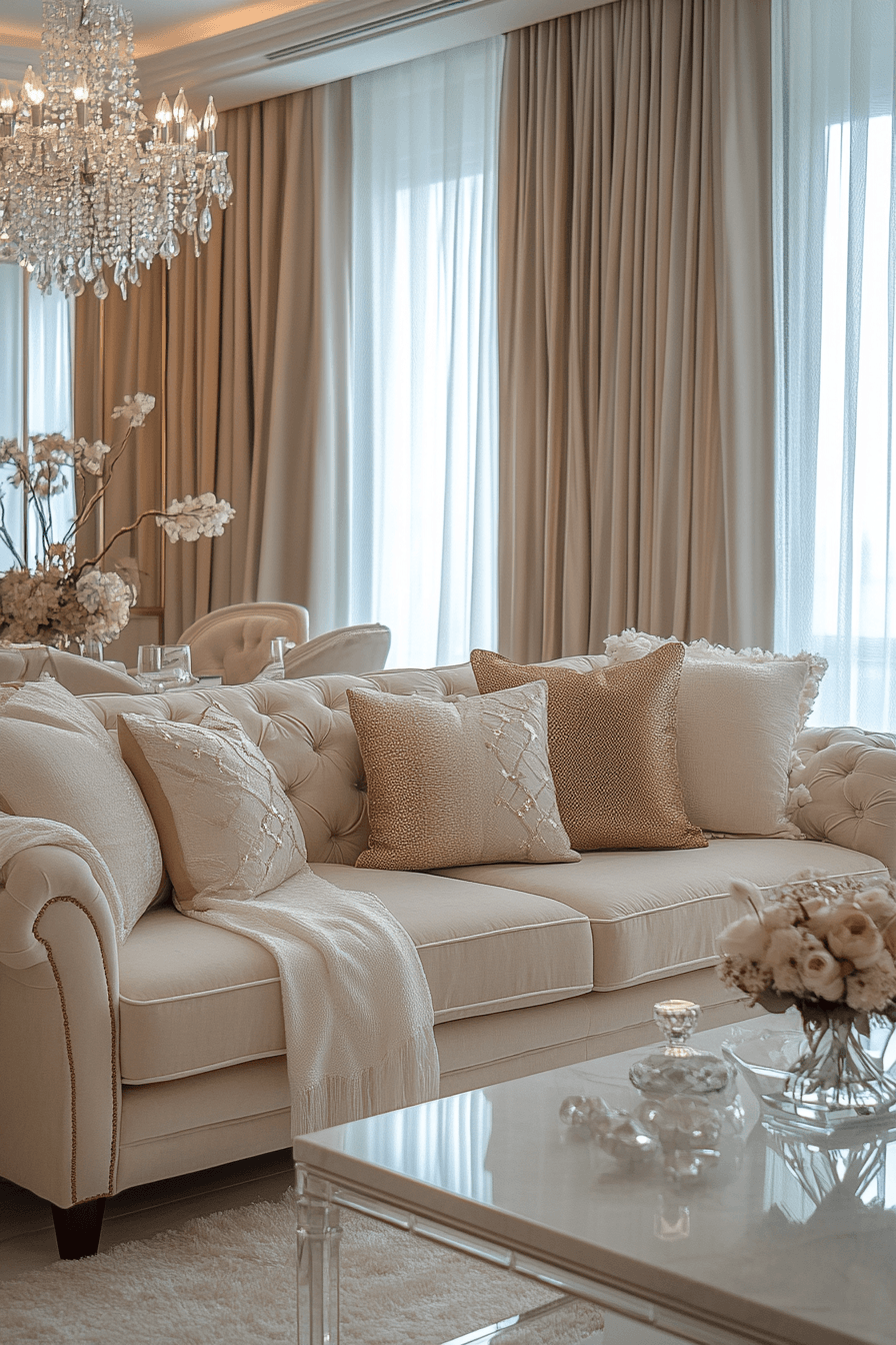 Iridescent details introduce a soft glow into a luxury living room design that feels serene and modern. Subtle shimmering fabrics add movement and elegance to the space. Neutral seating grounds the design while allowing reflective accents to shine. Glass décor enhances the luminous effect without cluttering the room. Warm lighting keeps the space inviting and balanced. Create a calm yet radiant living room now.