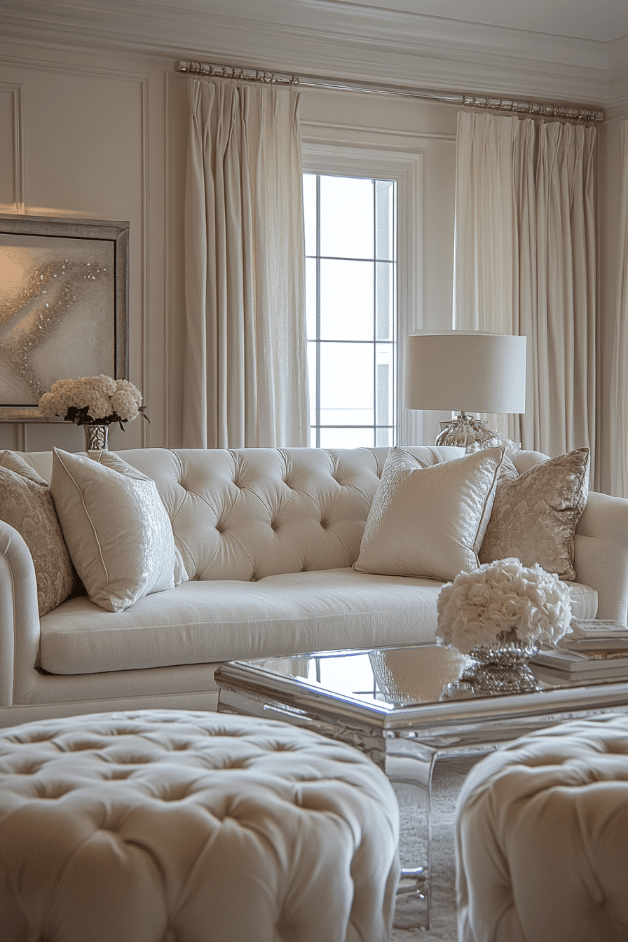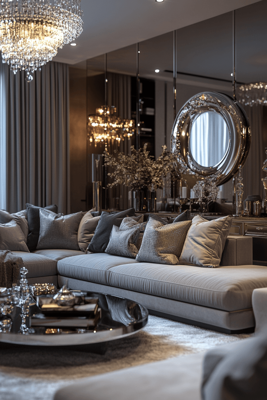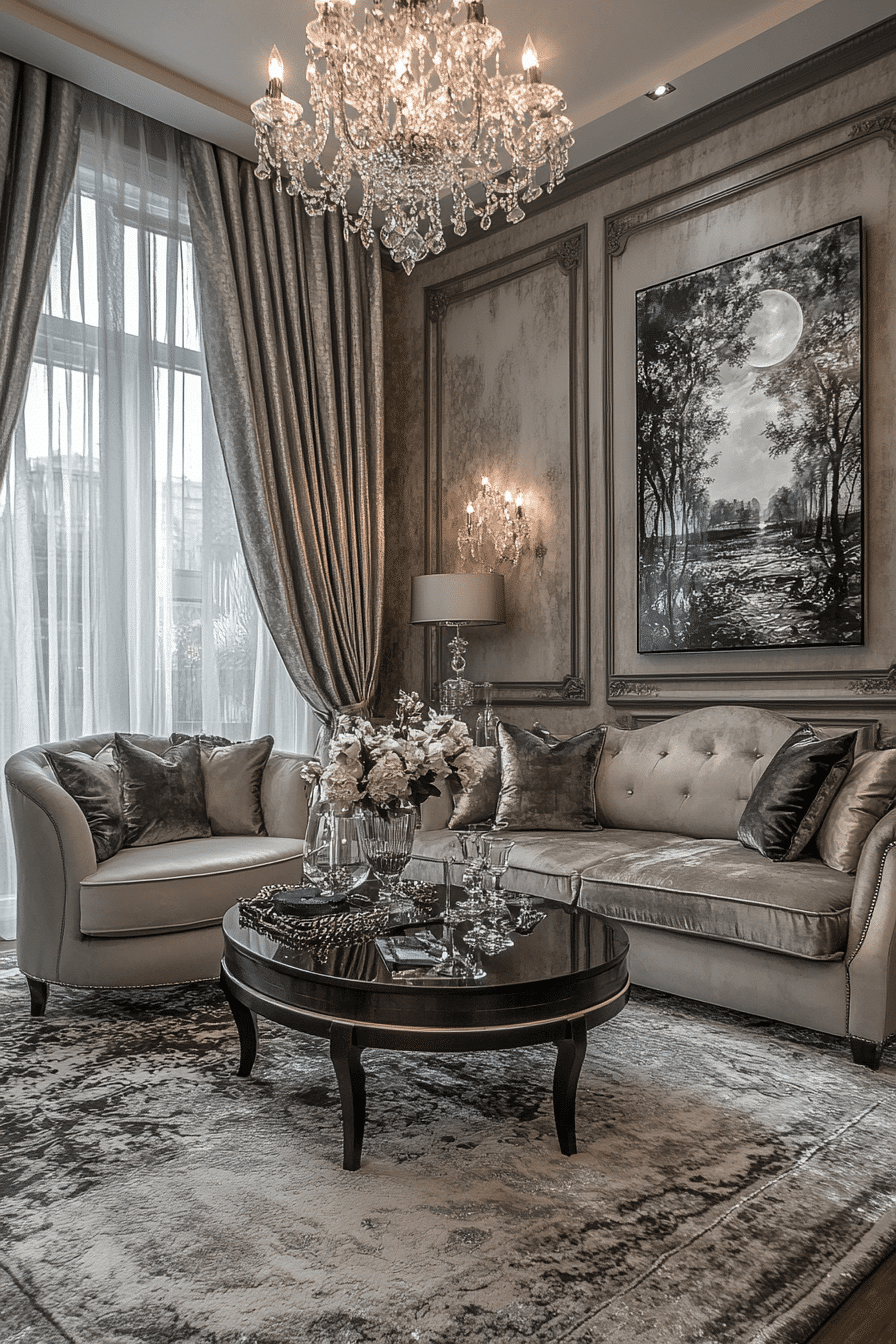 Cool silver tones define a luxury living room design inspired by sleek sophistication. Metallic finishes on décor and furniture add a polished touch. Grey seating and neutral rugs soften the palette for comfort. Crystal lighting introduces a refined sparkle without overwhelming the design. Layered textures ensure the space feels cozy despite its sleekness. Bring cool-toned elegance into your living room today.