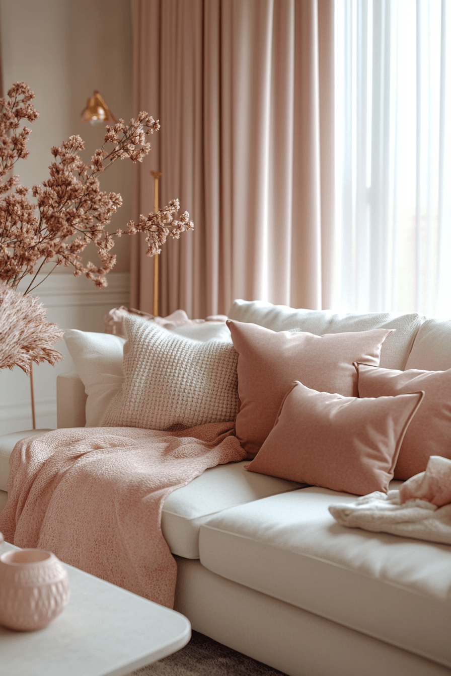 Muted rose tones create a luxury living room design that feels soft, romantic, and inviting. Gentle hues warm up the neutral base beautifully. Metallic accents add a subtle shimmer. Plush textiles enhance both comfort and elegance. Soft lighting completes the romantic ambiance. Create a charming and cozy living room today.