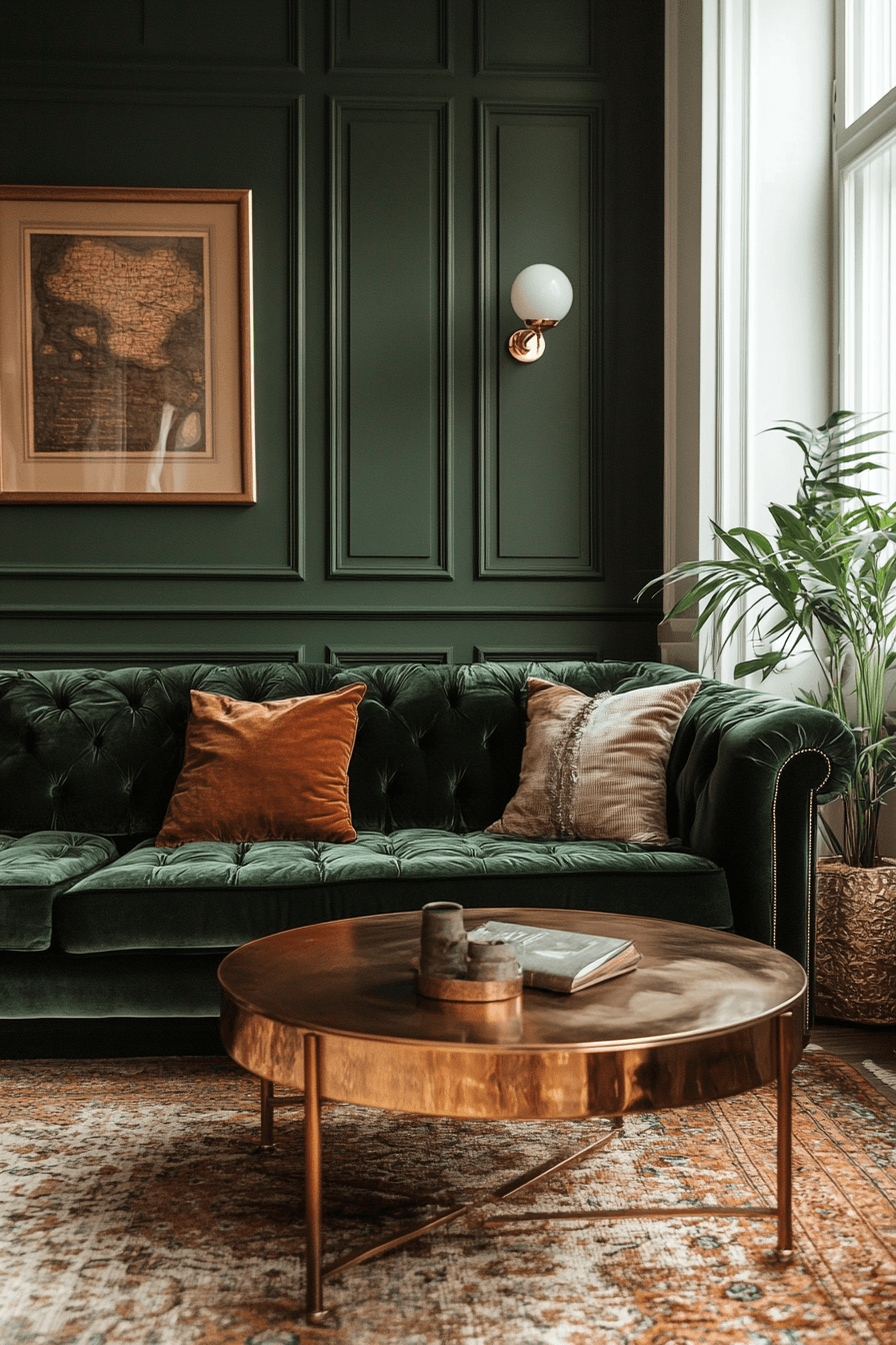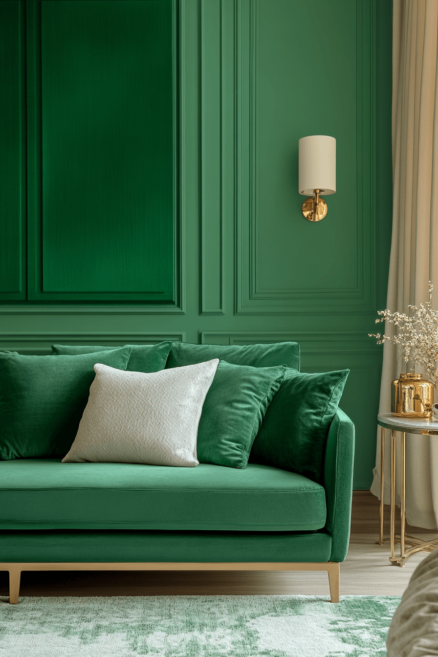 Deep emerald tones introduce richness and calm into a luxury living room design filled with sophistication. Jewel hues create visual depth while remaining elegant. Neutral elements balance the palette seamlessly. Metallic accents highlight the richness of green. Plush textures enhance comfort and warmth. Bring bold elegance into your living room now.