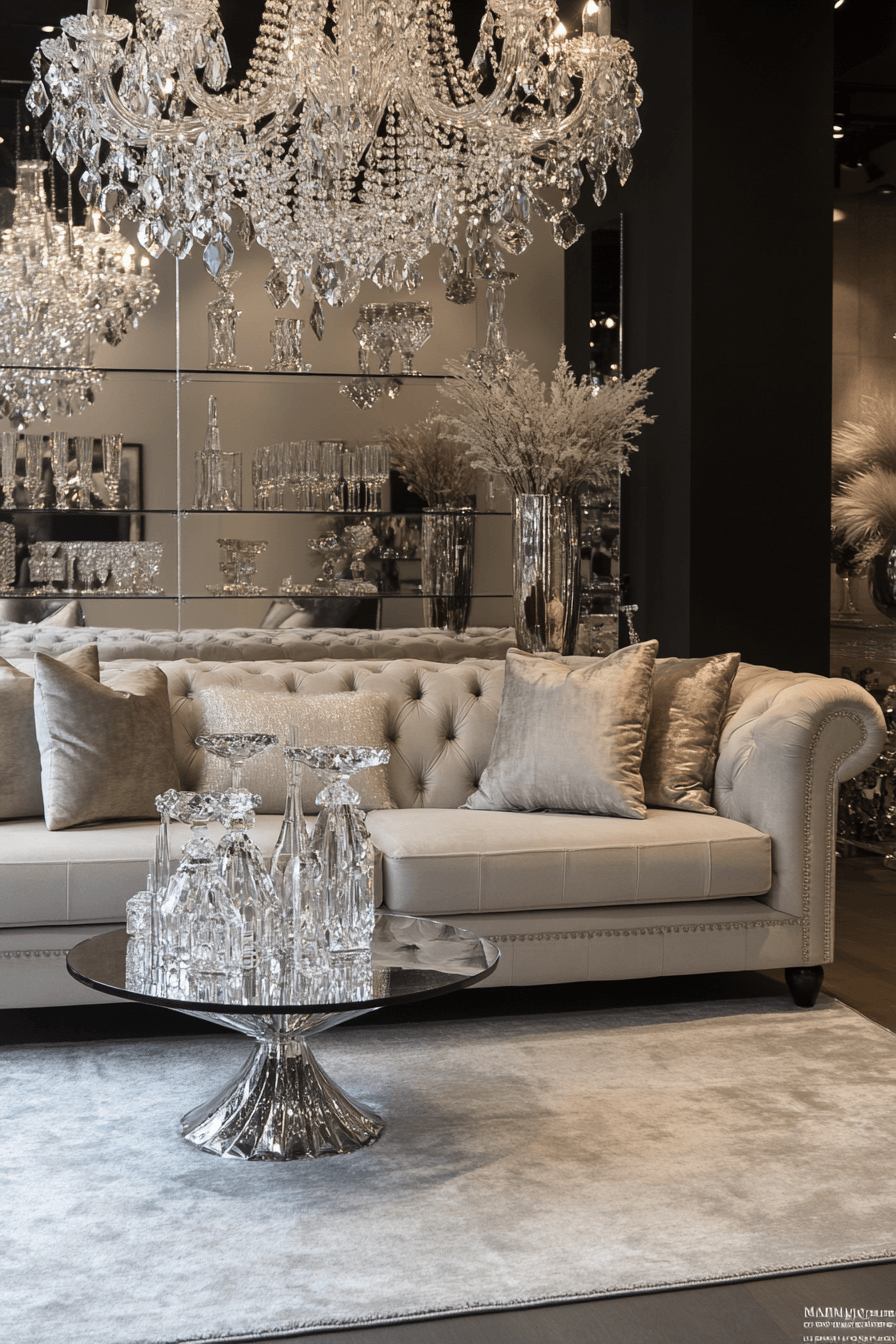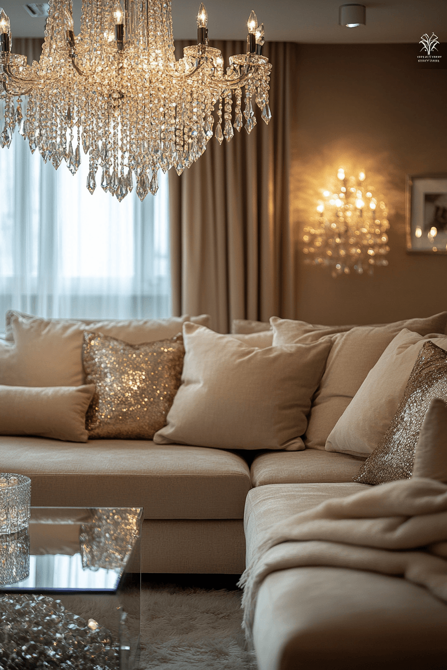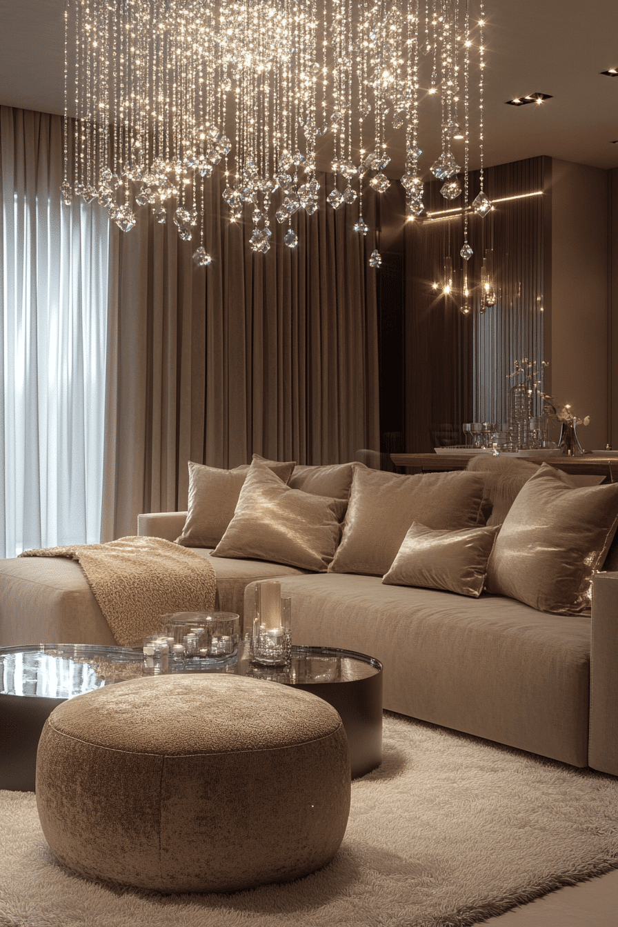 Crystal-inspired elements create a luxury living room design that sparkles with elegance and light. Reflective surfaces amplify brightness throughout the space. Neutral tones keep the design calm and balanced. Plush textiles add warmth and softness. Layered lighting enhances the radiant effect beautifully. Transform your living room into a sparkling retreat today.