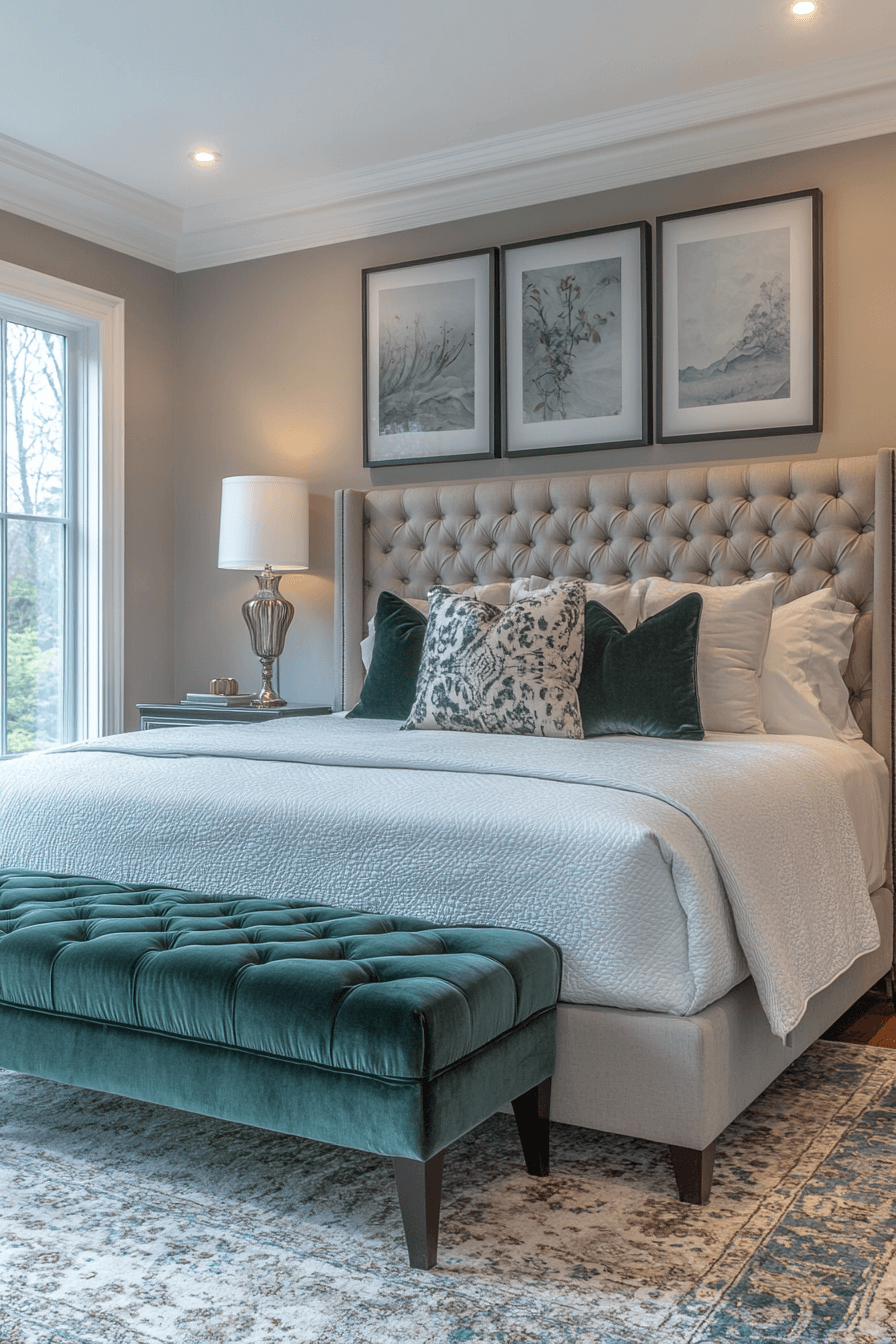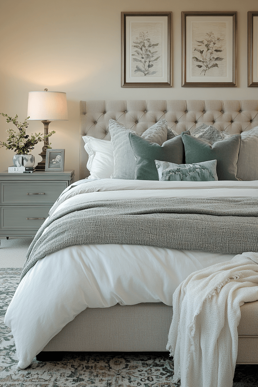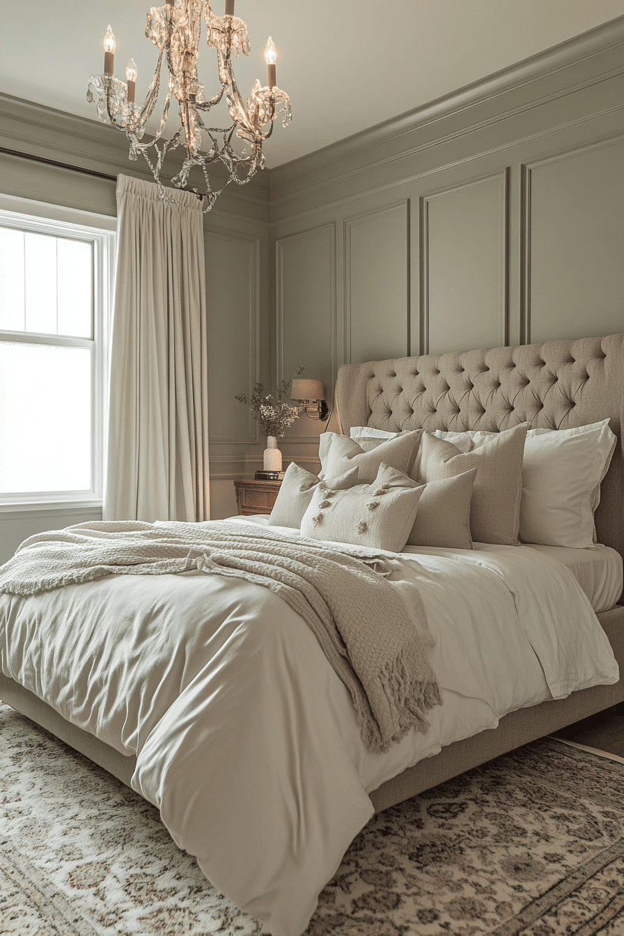 Calm color schemes define master bedrooms ideas for couples who prioritize relaxation. Gentle greens and soft greys create a soothing backdrop. Neutral elements keep the room open and balanced. A tufted bed adds elegance and comfort. Lighting enhances the peaceful atmosphere throughout. Design a calming retreat you’ll love coming home to.