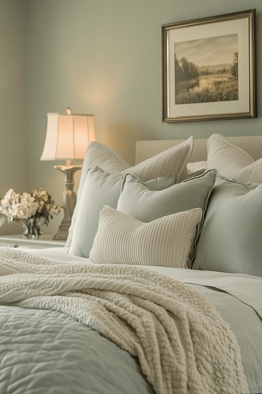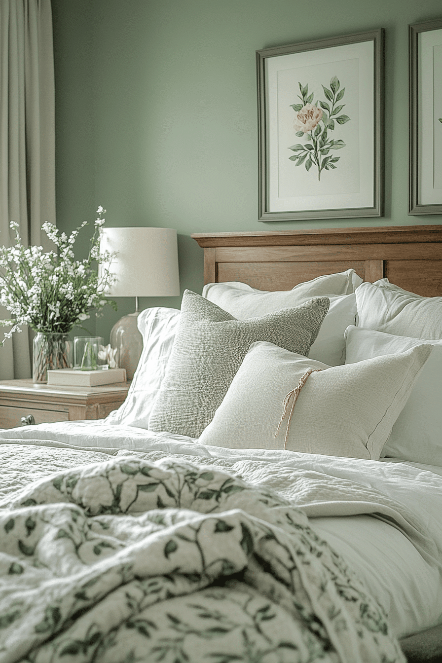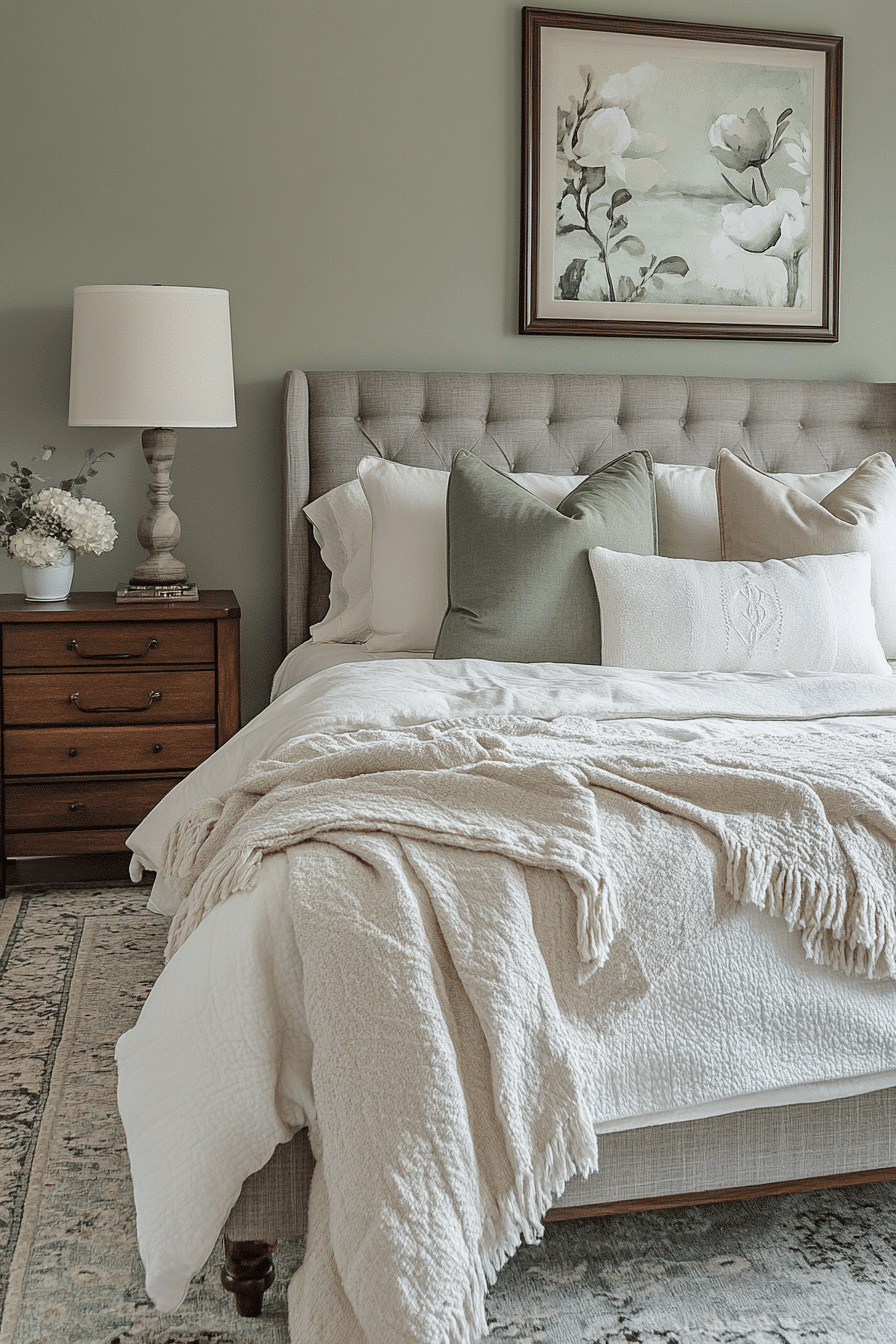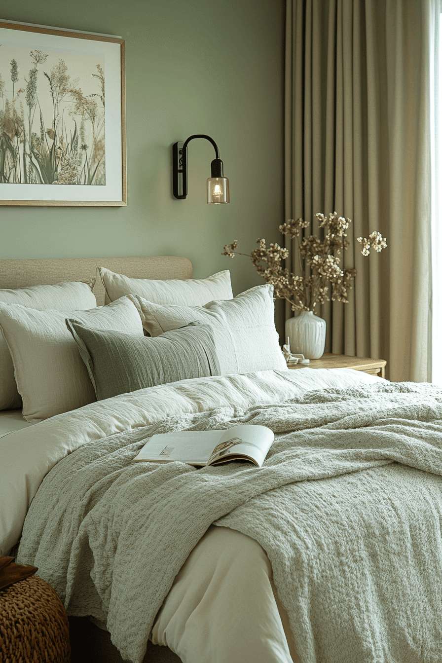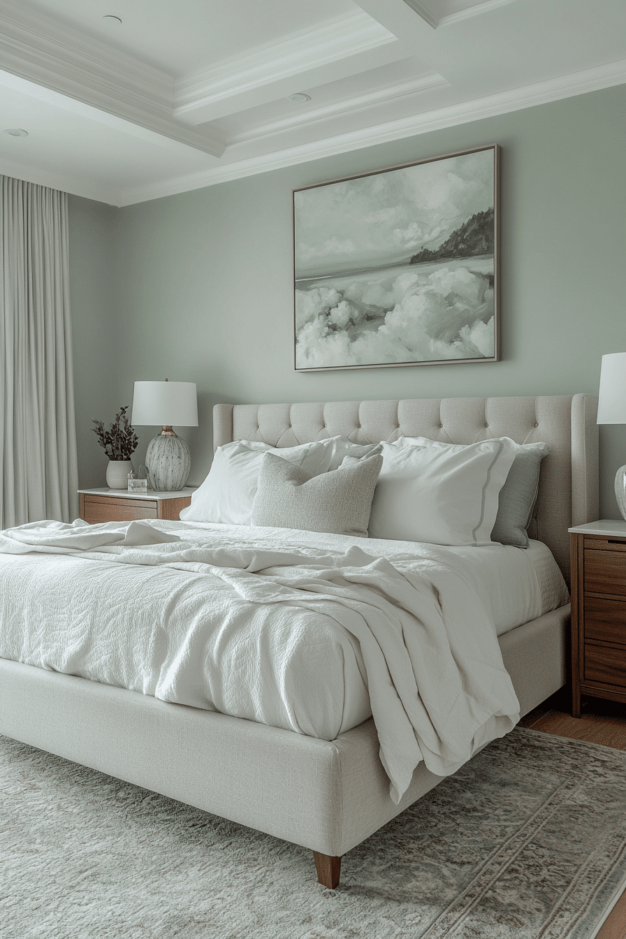 Peaceful tones create master bedrooms ideas for couples that feel calm and welcoming. Soft sage walls set a relaxing foundation. Neutral bedding keeps the design light and airy. Streamlined furniture enhances functionality. Warm lighting adds a cozy finish. Transform your space into a peaceful haven today.