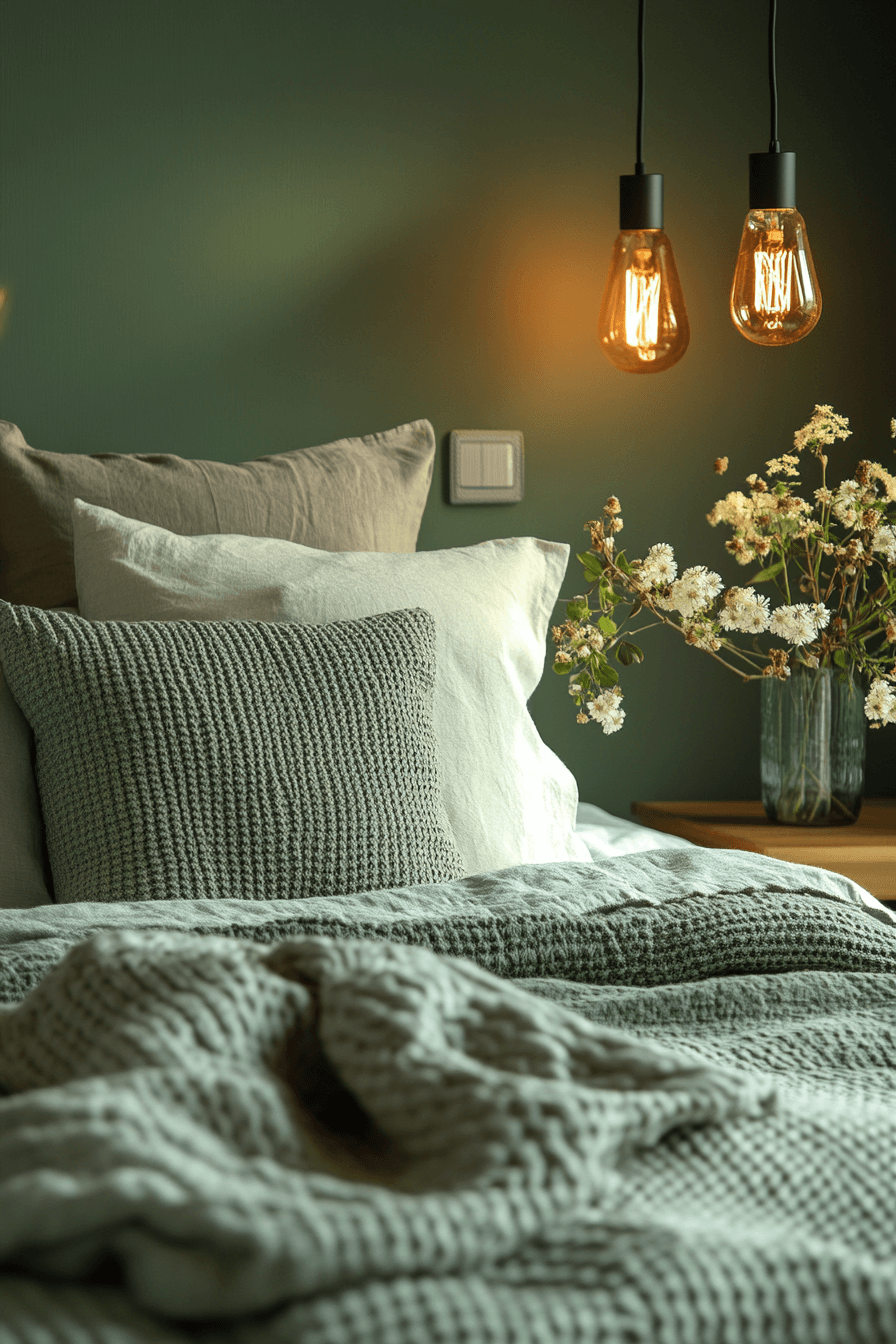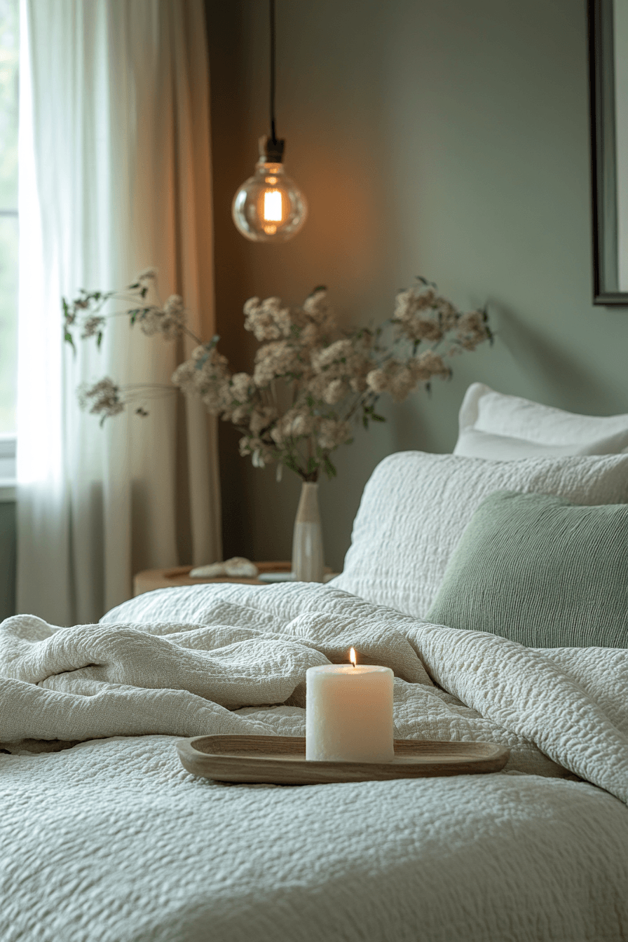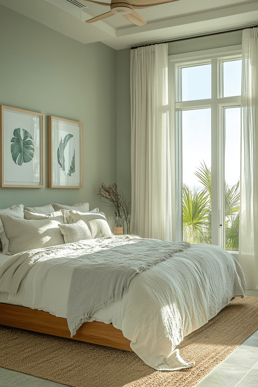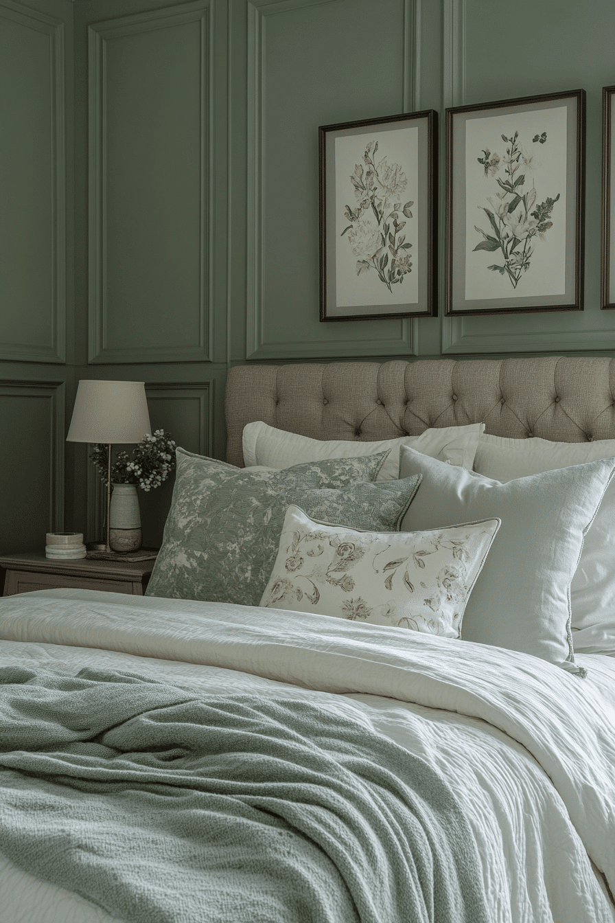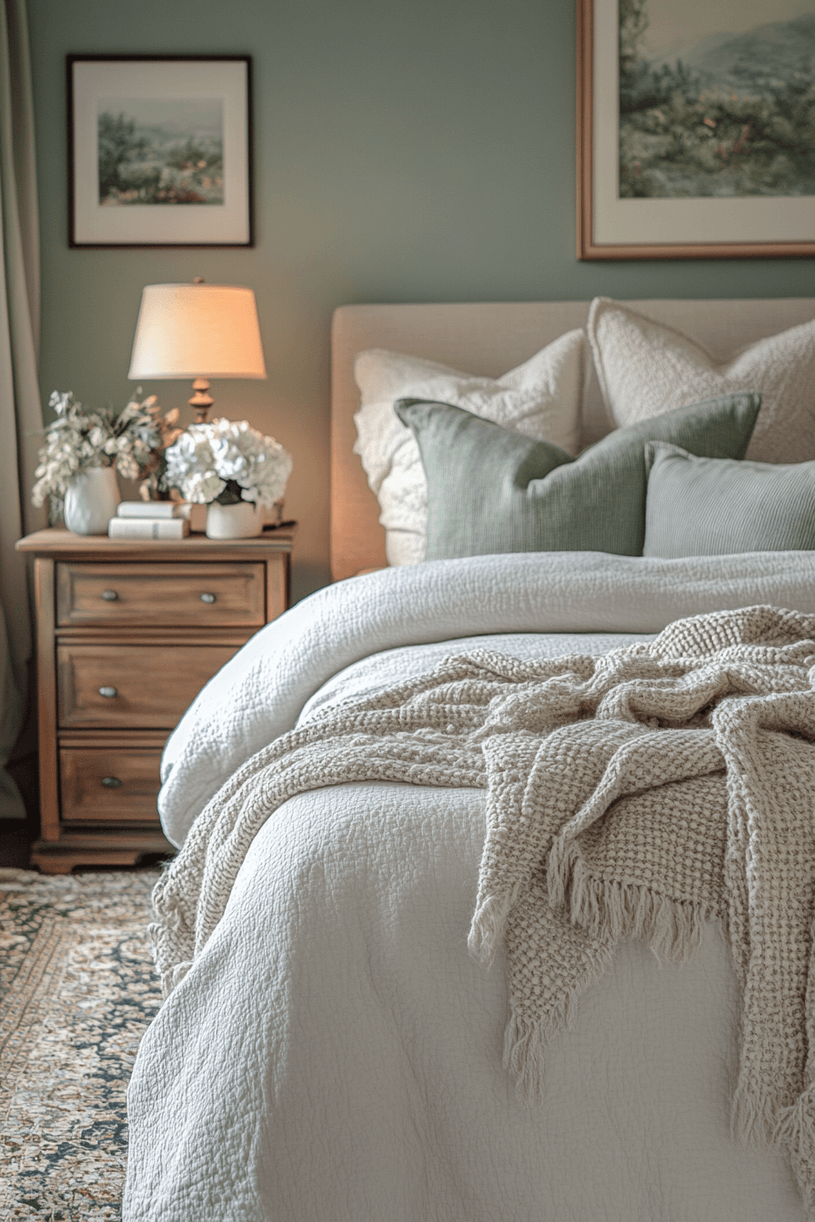 Peaceful tones create master bedrooms ideas for couples that feel calm and welcoming. Soft sage walls set a relaxing foundation. Neutral bedding keeps the design light and airy. Streamlined furniture enhances functionality. Warm lighting adds a cozy finish. Transform your space into a peaceful haven today.