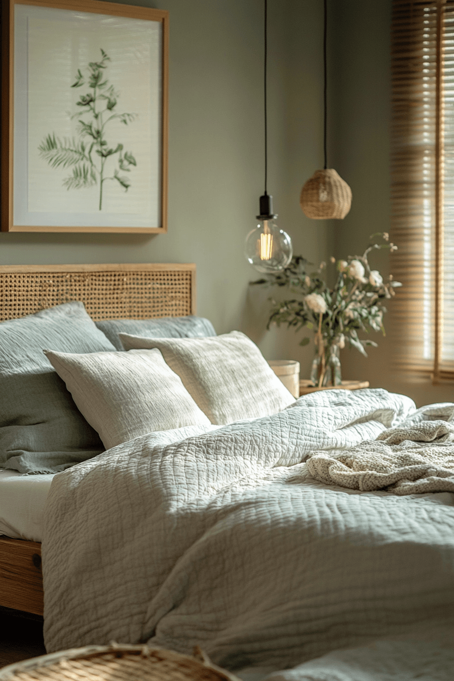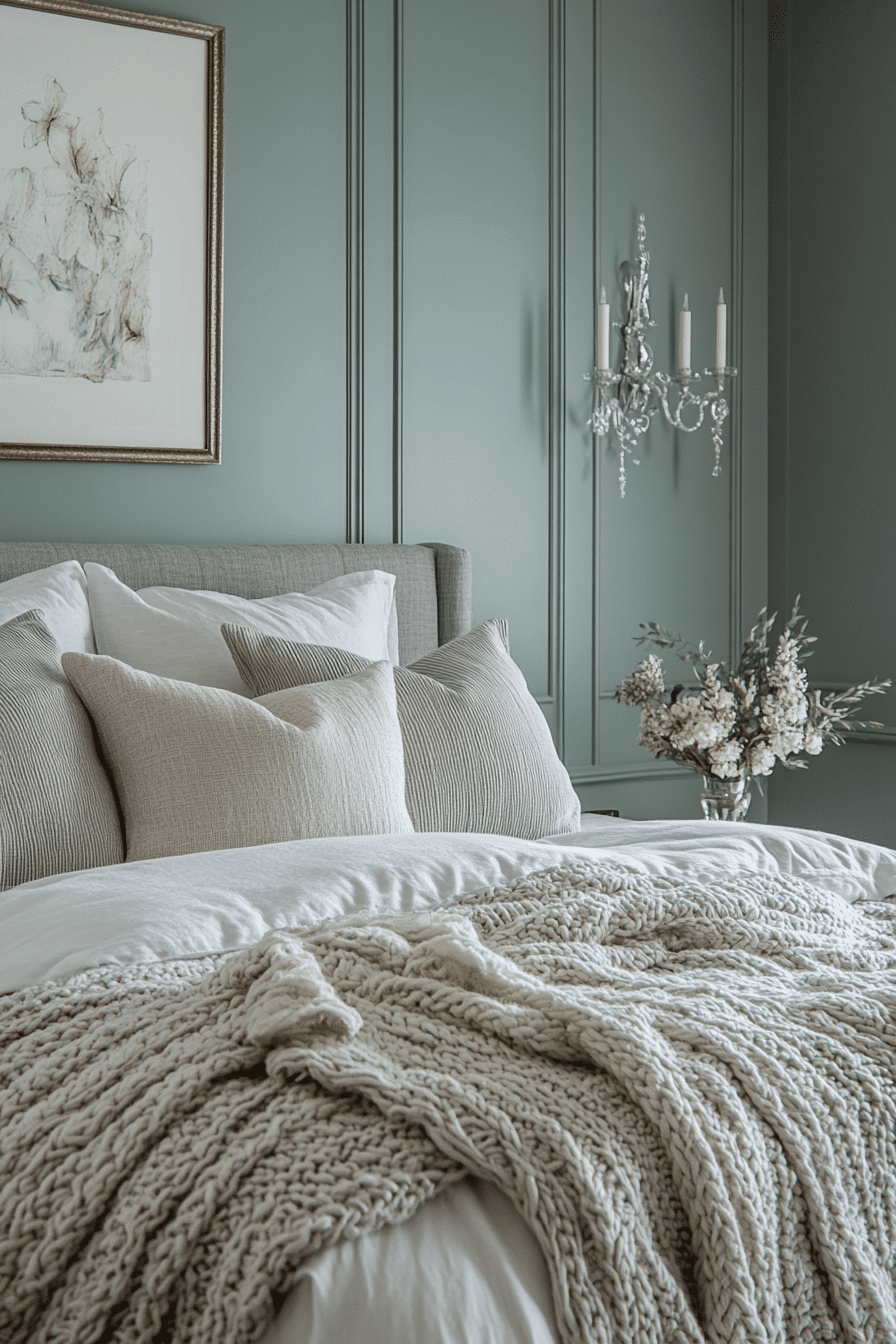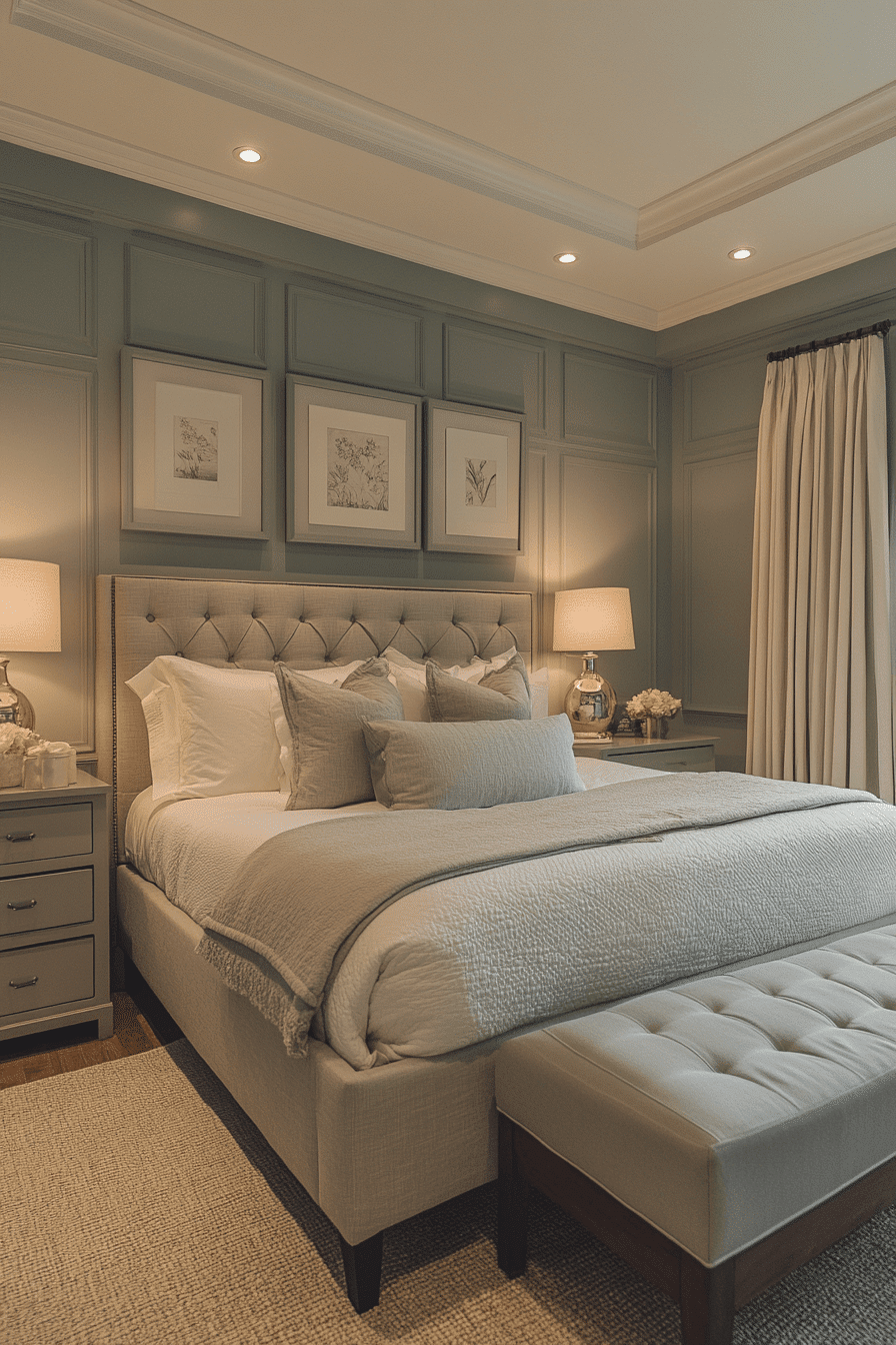 Refined details define master bedrooms ideas for couples who enjoy a polished aesthetic. Soft sage and grey tones create a calming visual flow. Neutral accents maintain balance throughout the space. Elegant bedding enhances the overall sophistication. Lighting adds a subtle, glowing finish. Elevate your bedroom with a refined touch today.