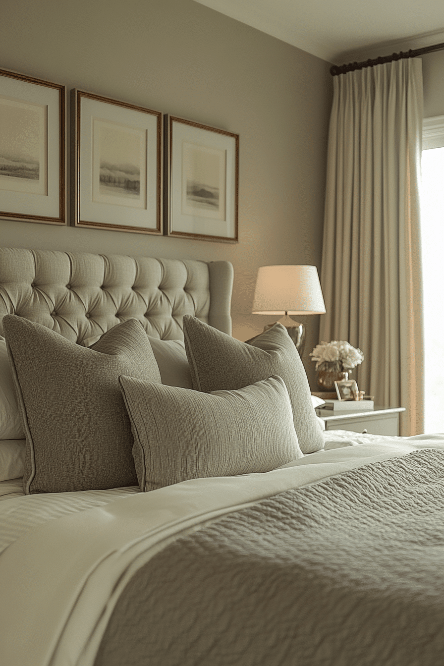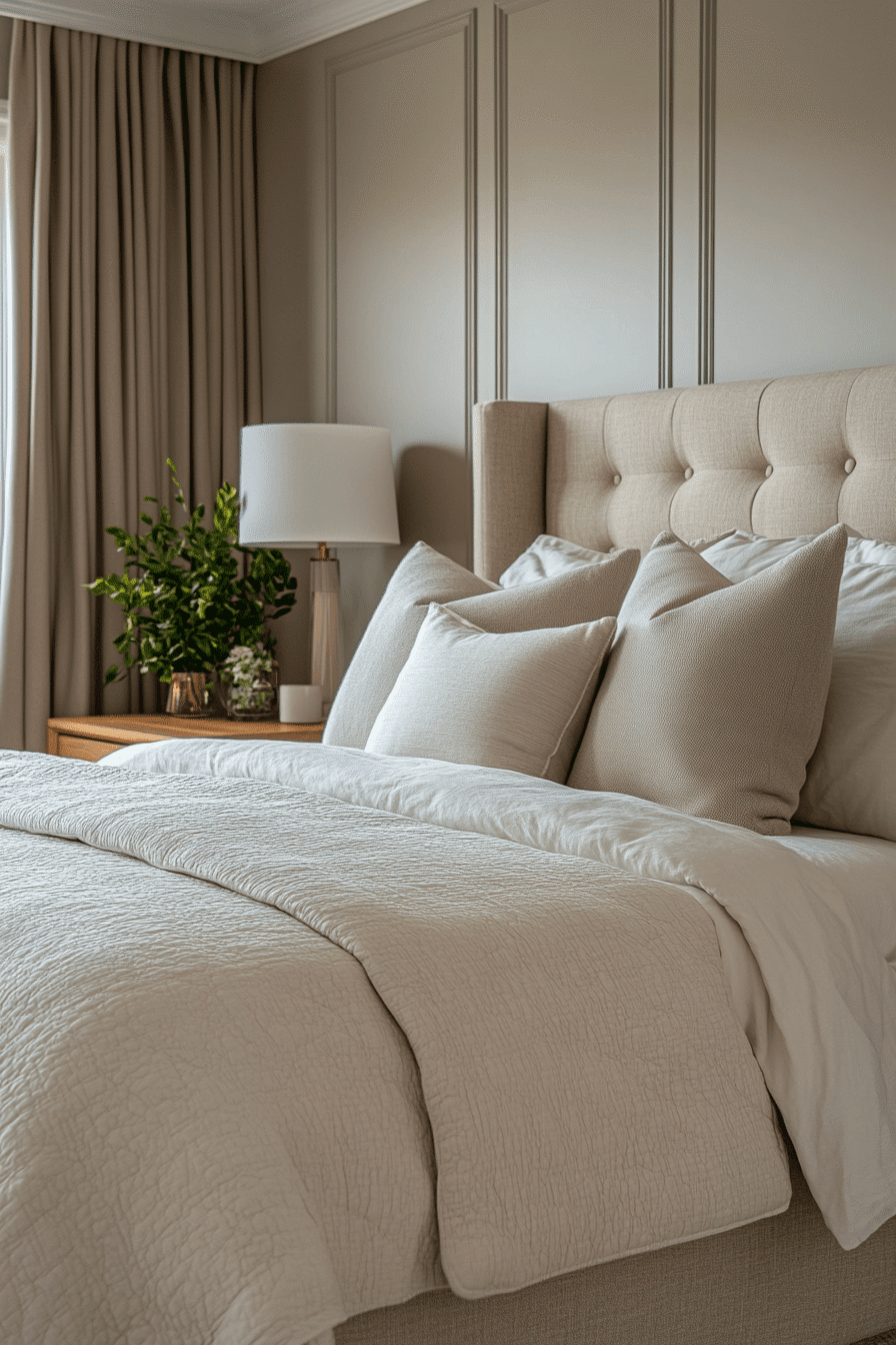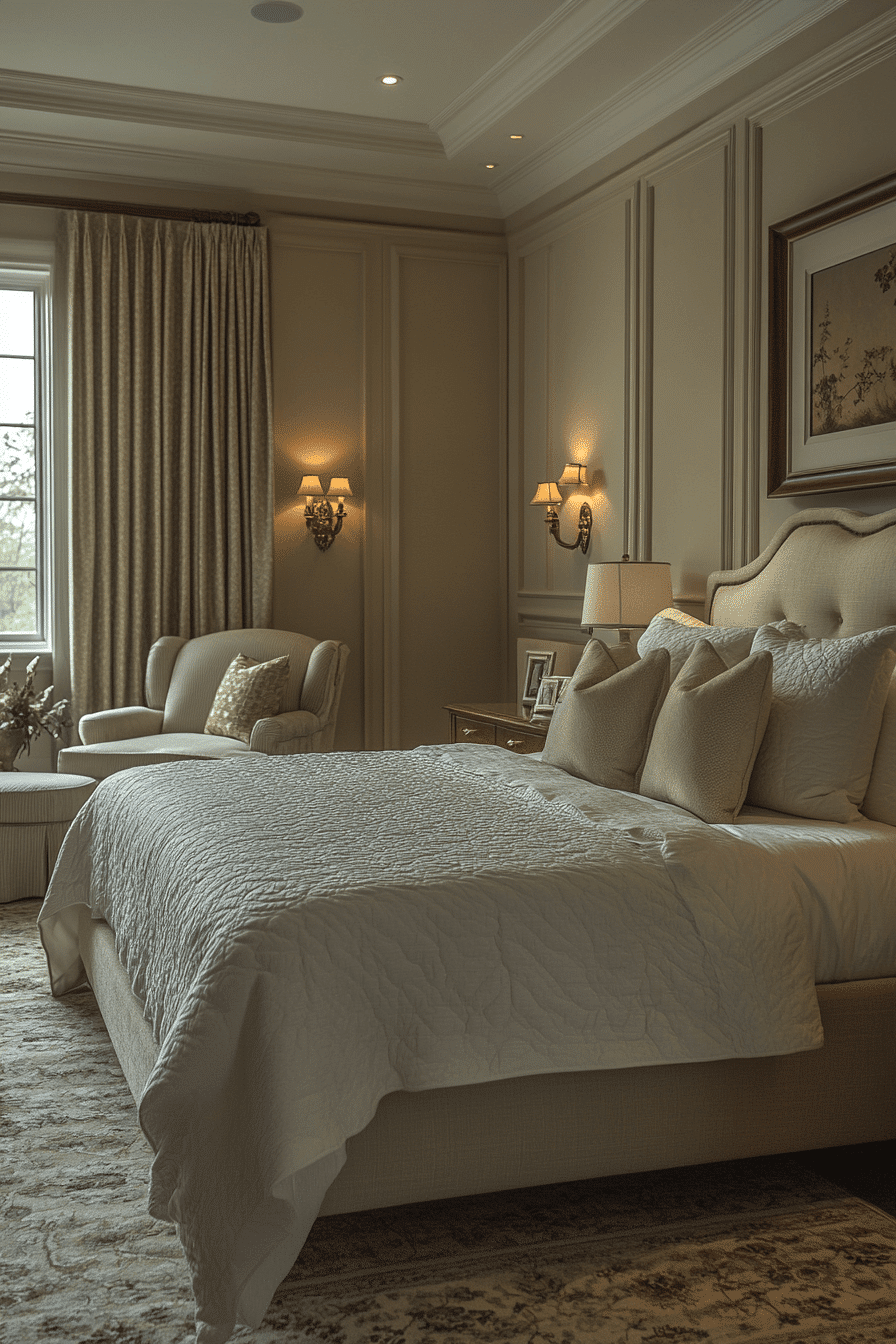 Graceful tones and polished finishes define master bedrooms ideas for couples drawn to elegance. Shades of beige, cream, and soft grey create a refined and calming palette. A beautifully styled bed becomes the visual centerpiece of the room. Coordinated decor and lighting enhance the balanced feel. Subtle details elevate the overall aesthetic without overwhelming it. Bring elegance into your bedroom and elevate your everyday.