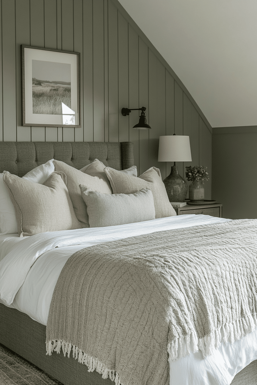 Balanced tones and thoughtful design define master bedrooms ideas for couples who value harmony. Sage walls and grey furnishings create a seamless blend. Neutral bedding ties the look together effortlessly. Slim furniture keeps the space practical and uncluttered. Lighting enhances the calming mood. Create a harmonious bedroom you’ll love.