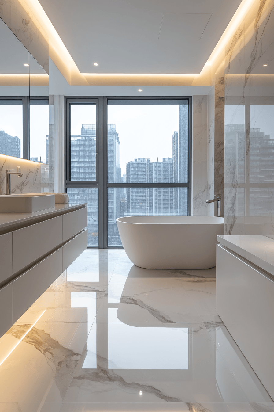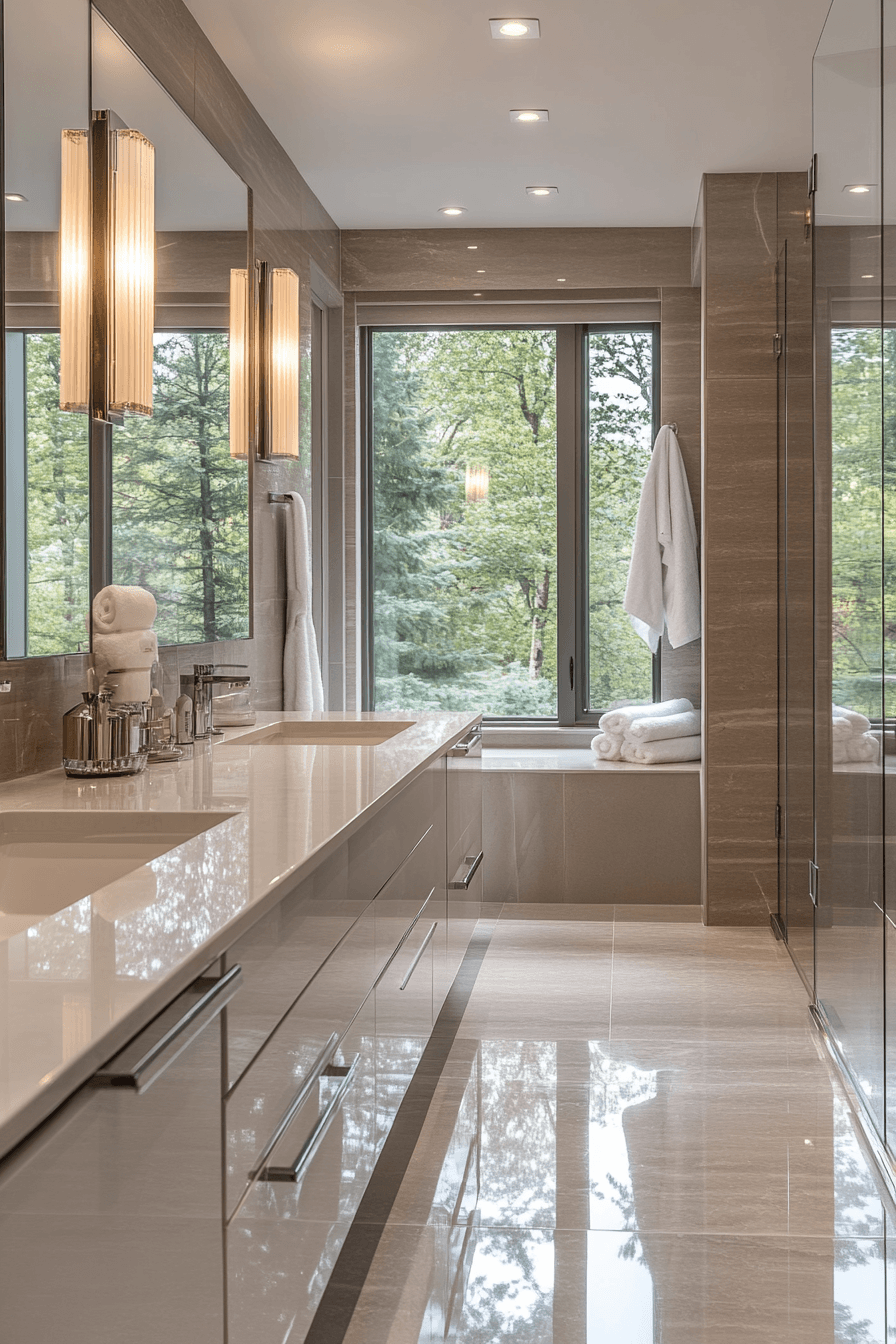 Glossy finishes create a modern luxury bathroom that feels sleek, bright, and refined. Polished surfaces amplify light throughout the space. Metallic accents enhance the modern aesthetic. Clean lines maintain simplicity. The overall look feels elevated and sophisticated. Click here to explore polished modern luxury bathroom inspirations.
