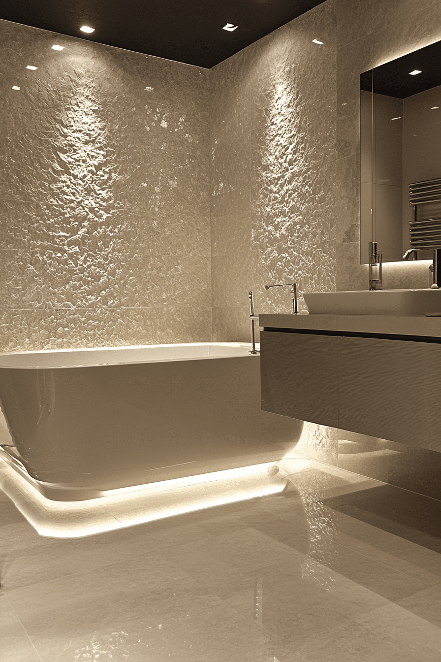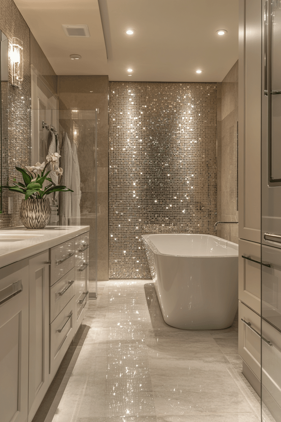 Shimmering tile finishes introduce subtle elegance into a modern luxury bathroom filled with light and texture. Pearl-like surfaces reflect light gently across the room. Neutral tones maintain balance and calmness. Soft iridescence adds dimension without overwhelming the space. Lighting enhances the delicate shine. Click to explore luminous tile ideas for your modern luxury bathroom.