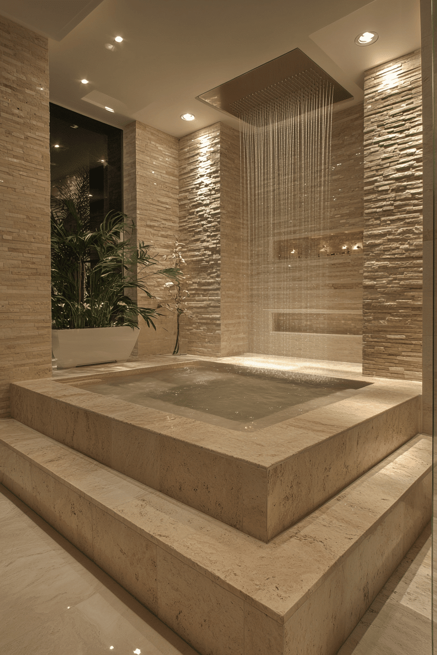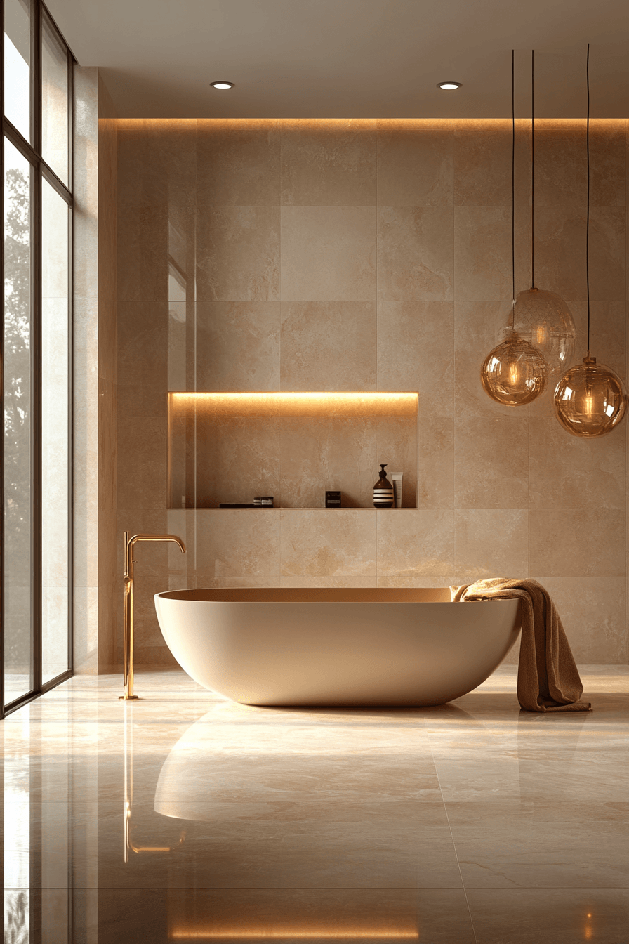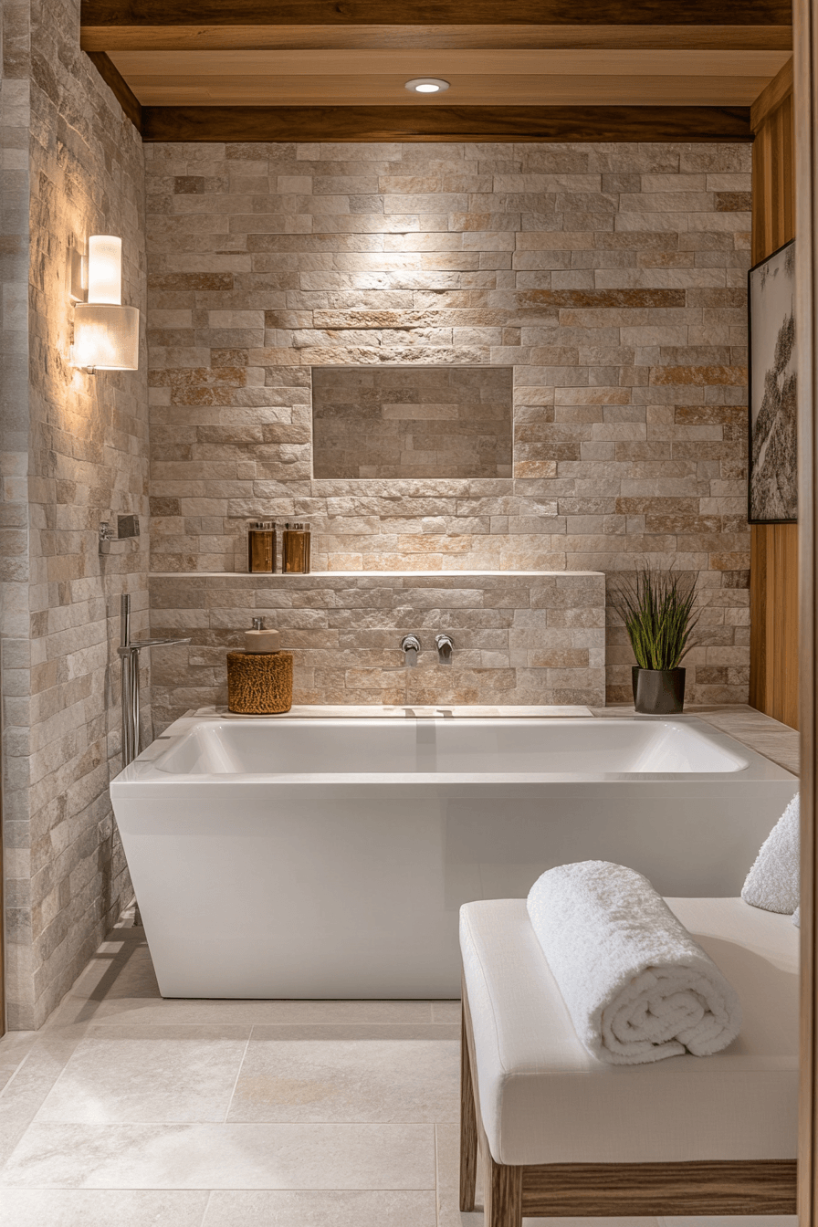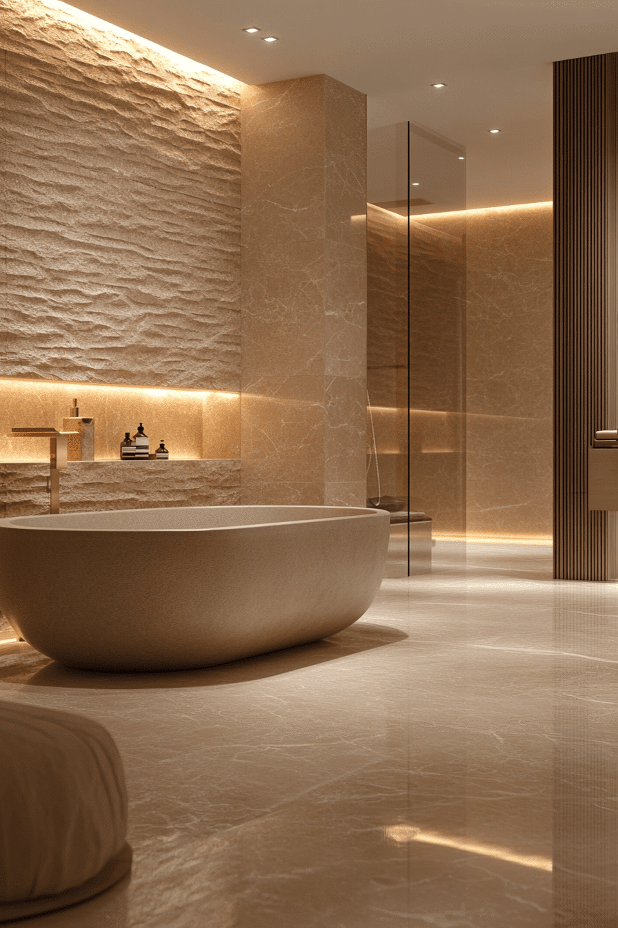Neutral stone textures create harmony in a modern luxury bathroom with understated elegance. Soft tones bring warmth and simplicity. Organic materials add depth and texture. Metallic accents enhance the refined look. Lighting highlights the natural beauty. Tap here to explore balanced stone-inspired modern luxury bathroom ideas.