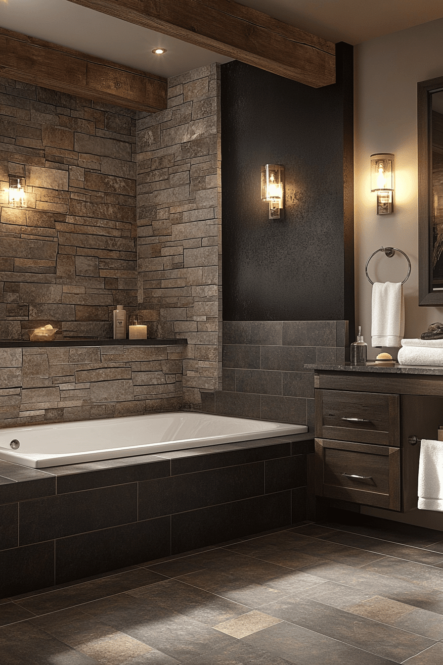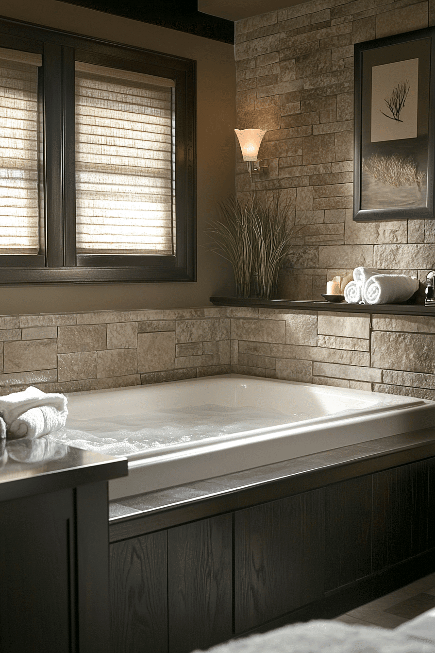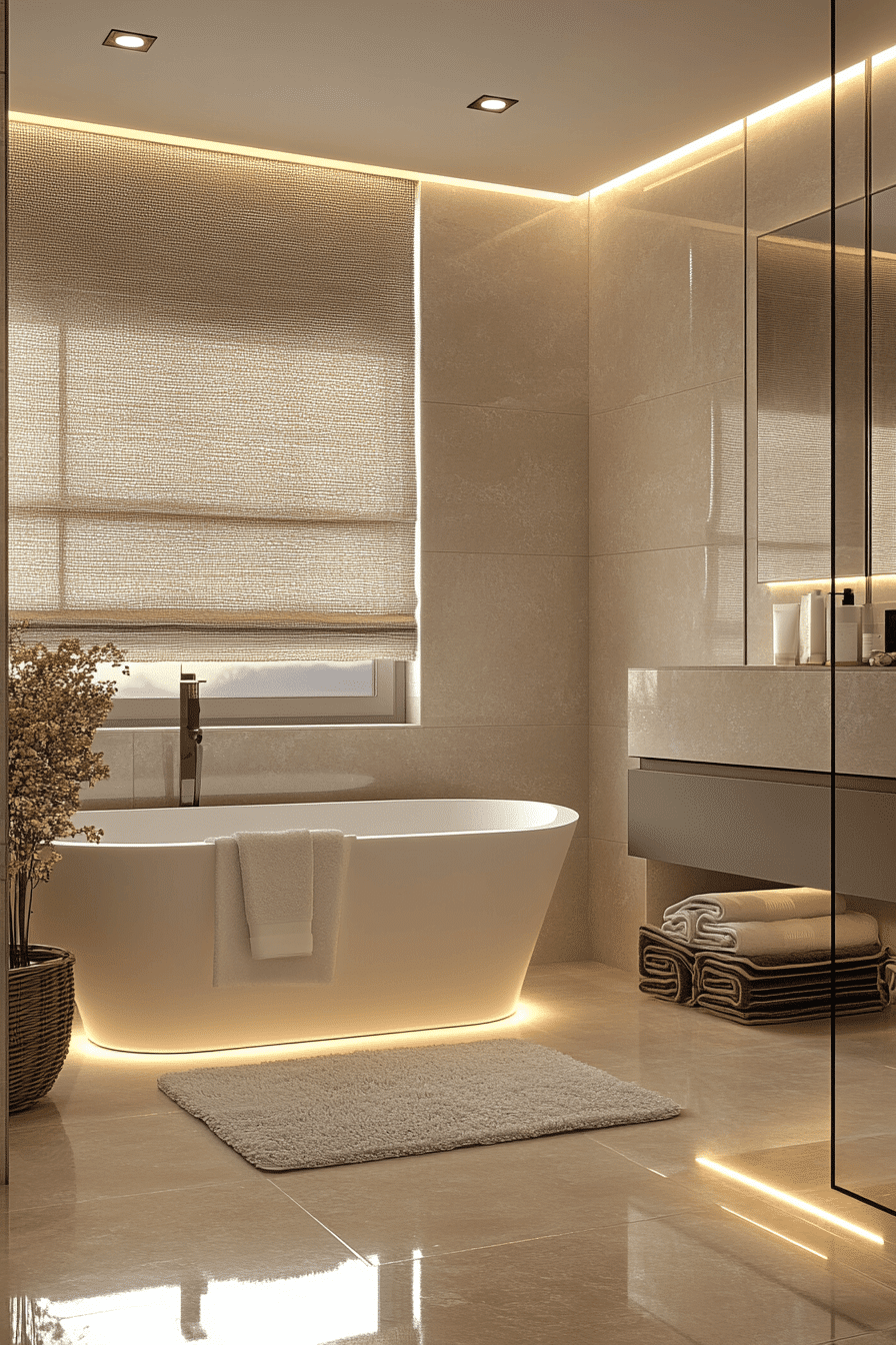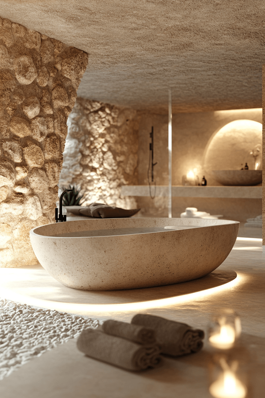 Soft textures and neutral tones create a modern luxury bathroom designed for comfort and relaxation. Plush elements enhance the inviting feel. Elegant lighting sets a calming mood. Stone surfaces add sophistication. Every detail supports a peaceful environment. Tap here to explore cozy modern luxury bathroom inspirations.