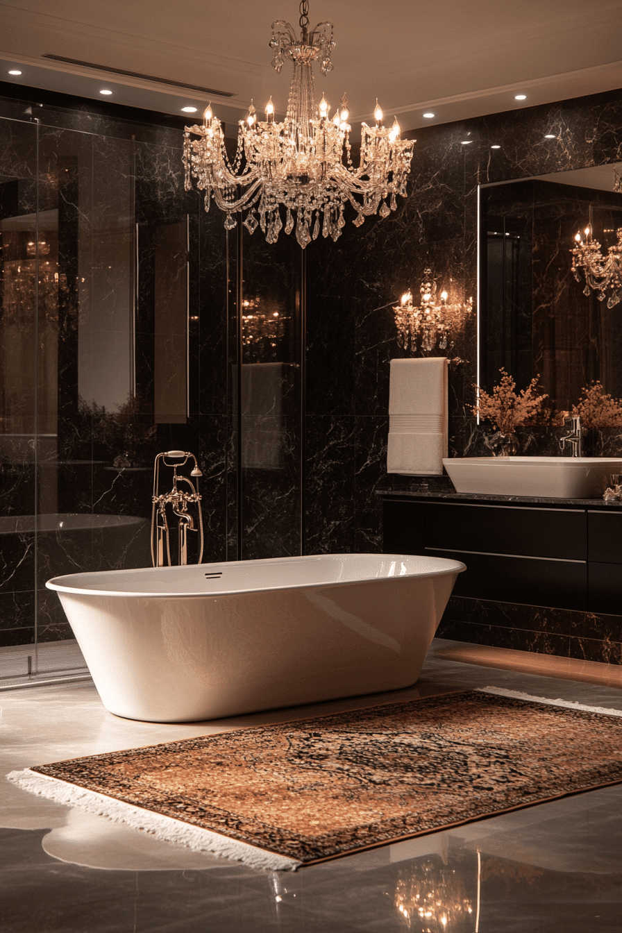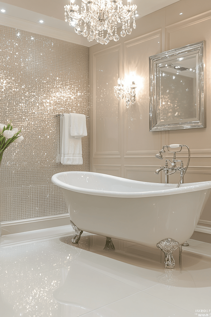 Sparkling crystal accents bring brilliance into a modern luxury bathroom that feels bright, airy, and elevated. Reflective lighting fixtures create a radiant focal point. Mirrored surfaces expand the space visually. Polished countertops enhance the refined aesthetic. Soft lighting adds warmth to the shimmer. Click here to explore glowing crystal-inspired modern luxury bathroom ideas.