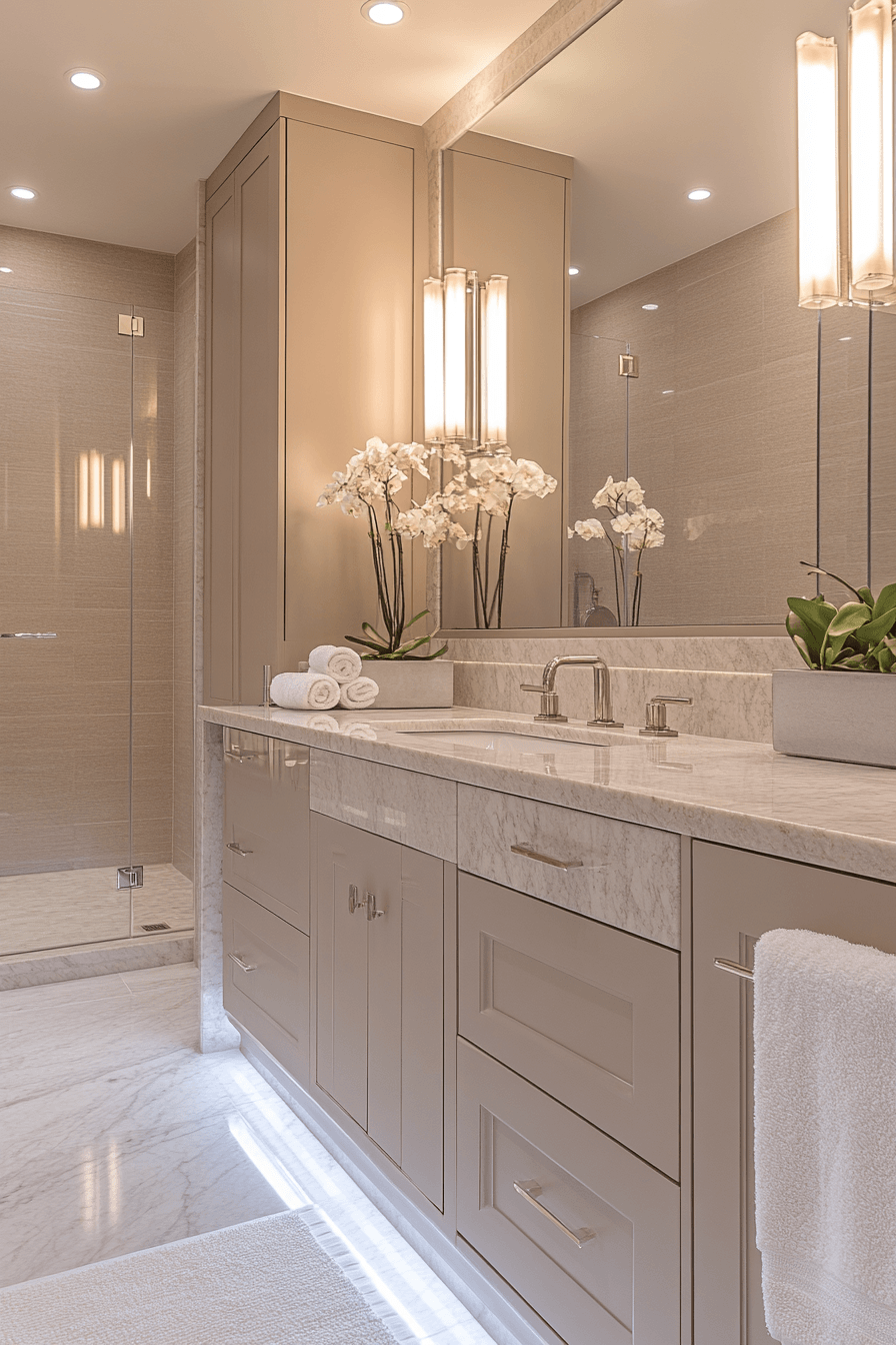 Sleek vanity designs redefine a modern luxury bathroom by blending style with smart functionality. High-gloss cabinetry creates a polished and organized aesthetic. Integrated lighting enhances both visibility and elegance. Neutral palettes allow the vanity to stand out effortlessly. Hidden storage keeps the space uncluttered and refined. Tap to upgrade your modern luxury bathroom with a statement vanity setup.
