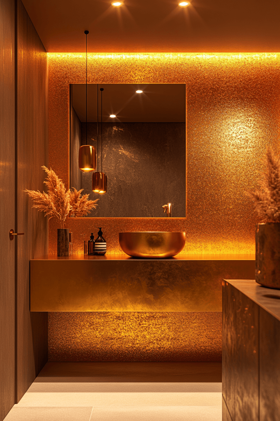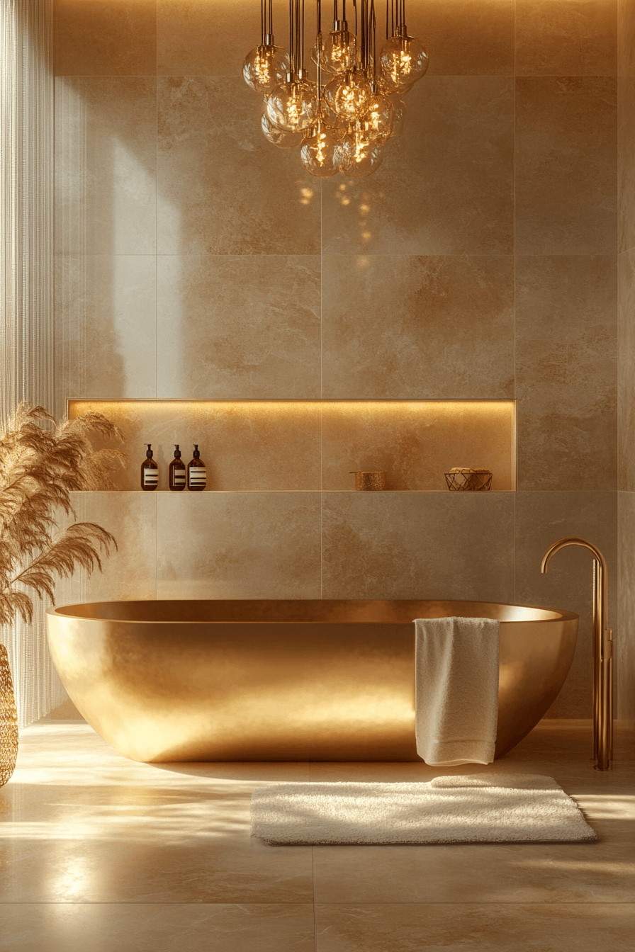 Warm metallic accents transform a modern luxury bathroom into a glowing, spa-like retreat filled with sophistication. Gold details across fixtures and mirrors reflect light beautifully. Neutral stone tones balance the richness for a refined finish. Layered materials add dimension and texture throughout the space. Thoughtful lighting highlights every golden detail. Click now to explore radiant modern luxury bathroom designs with golden warmth.