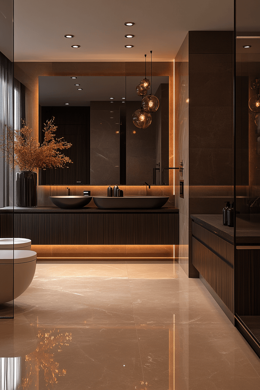 Elevated finishes create a modern luxury bathroom that feels rich, polished, and indulgent. Freestanding tubs paired with marble enhance the upscale look. Metallic accents add subtle glamour. Statement lighting adds visual interest. Every detail contributes to a refined experience. Tap here to explore opulent modern luxury bathroom inspirations.