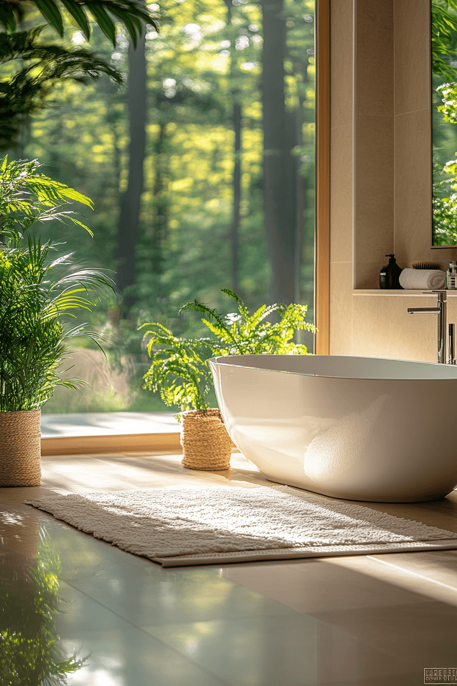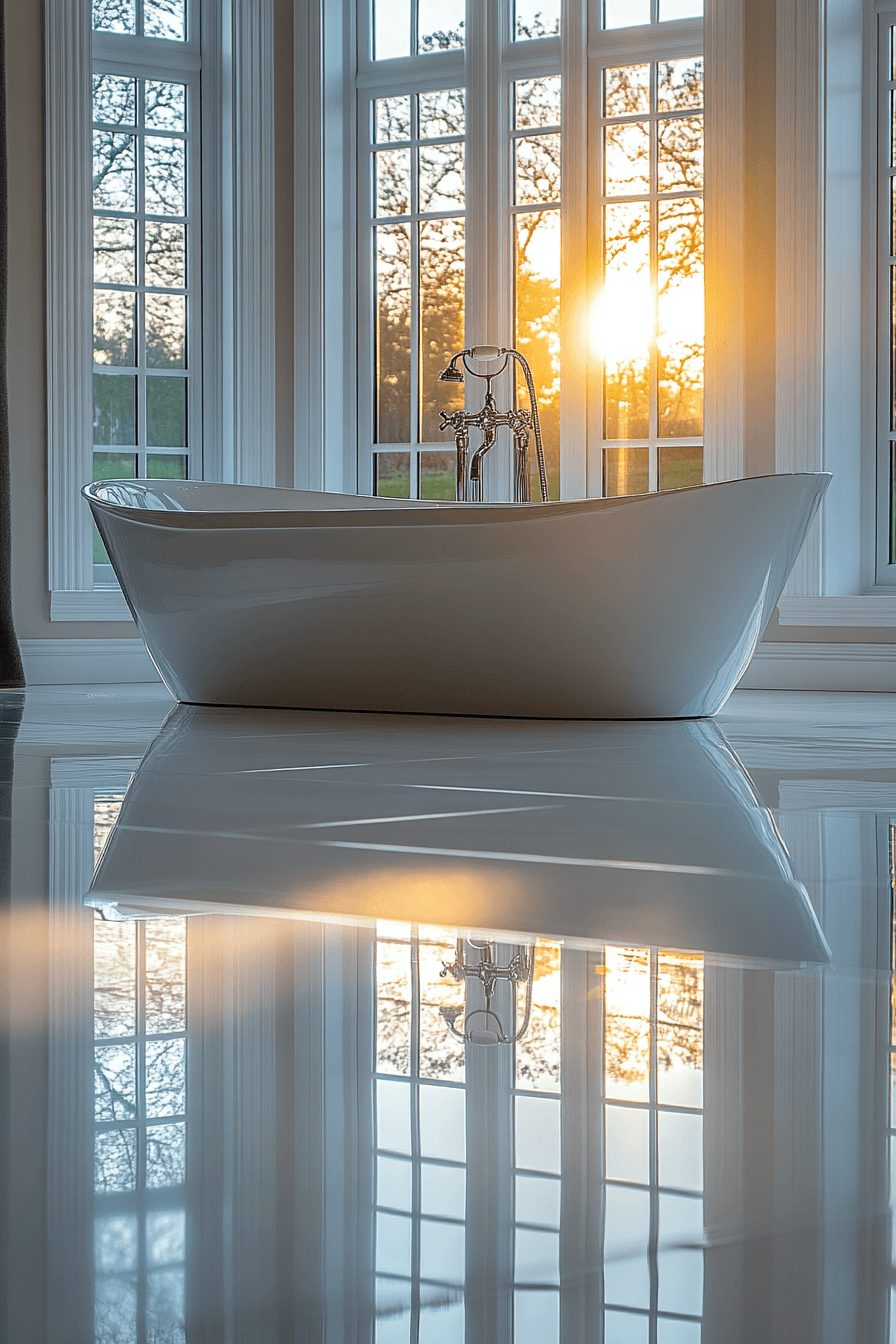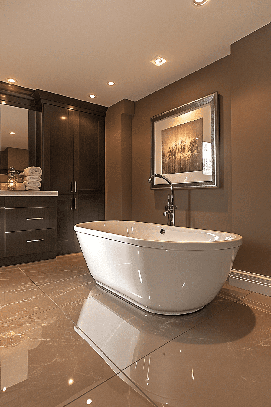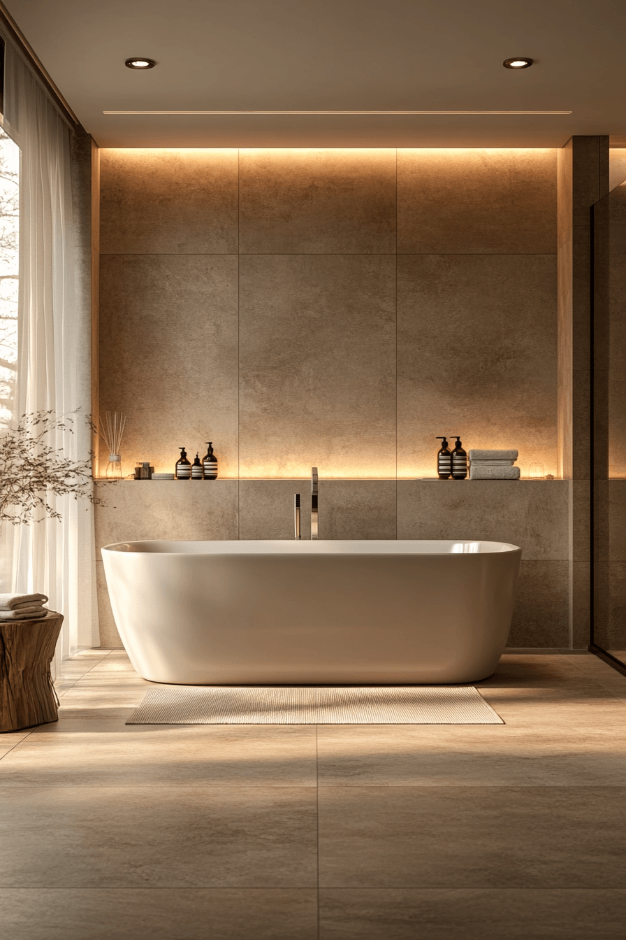 Freestanding tubs become sculptural focal points in a modern luxury bathroom designed for relaxation and style. Smooth curves add softness to the space. Surrounding textures enhance comfort and visual appeal. Lighting reflects across water surfaces for a calming ambiance. Every element contributes to a spa-inspired experience. Tap here to explore luxurious soaking tub ideas for your modern luxury bathroom.
