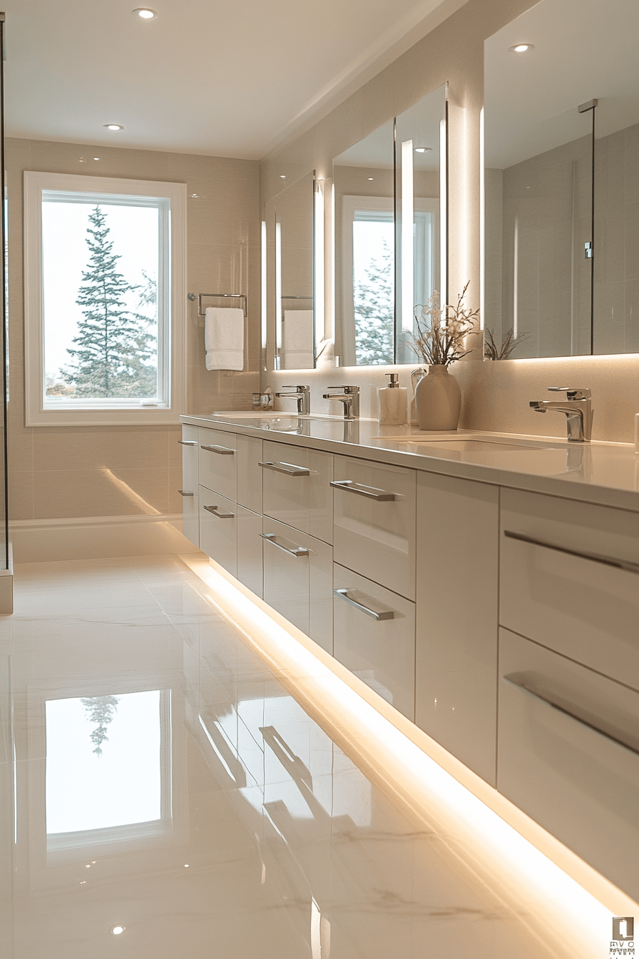 Mirrored vanity designs add brilliance to a modern luxury bathroom while maintaining function. Reflective cabinetry enhances light and space. Integrated lighting improves usability. Neutral palettes keep the design cohesive. Storage remains seamless and stylish. Click to explore elegant vanity ideas for your modern luxury bathroom.