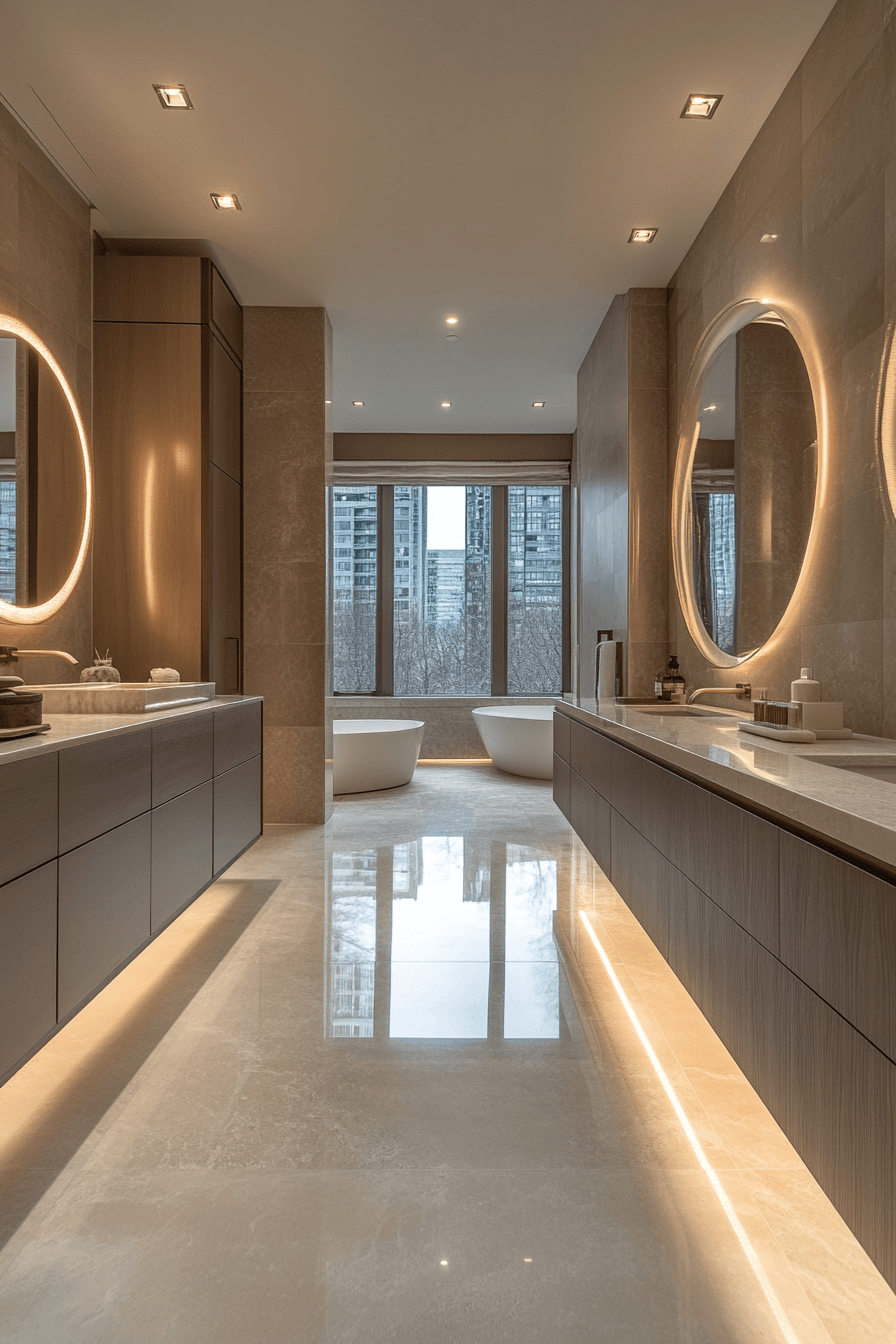 Backlit mirrors enhance a modern luxury bathroom by adding both functionality and visual impact. Large reflective surfaces amplify light and openness. Sleek frames maintain a clean, modern look. Paired with minimalist vanities, the design feels cohesive. Soft illumination adds a refined glow. Tap here to explore mirror-focused modern luxury bathroom inspirations.