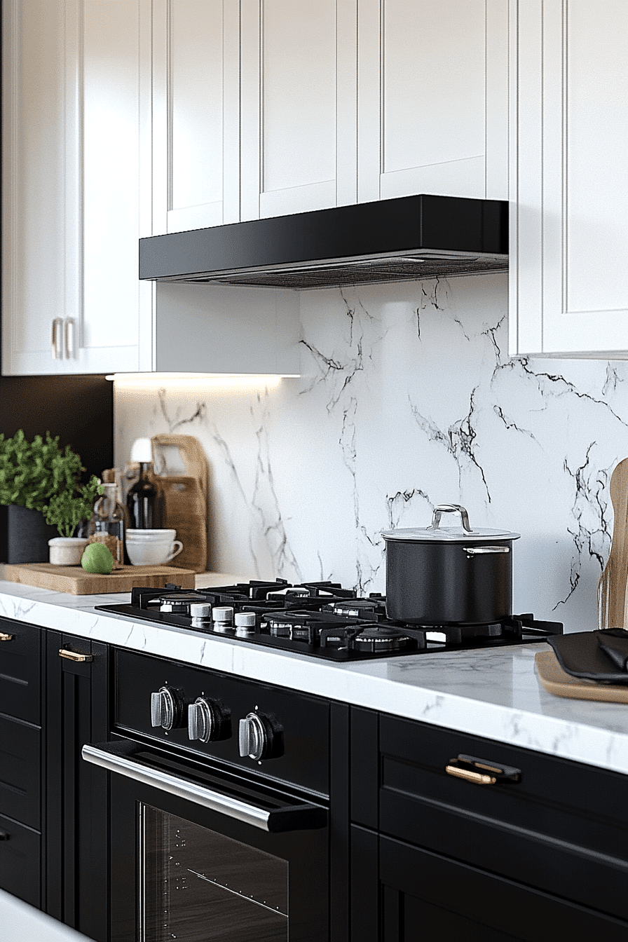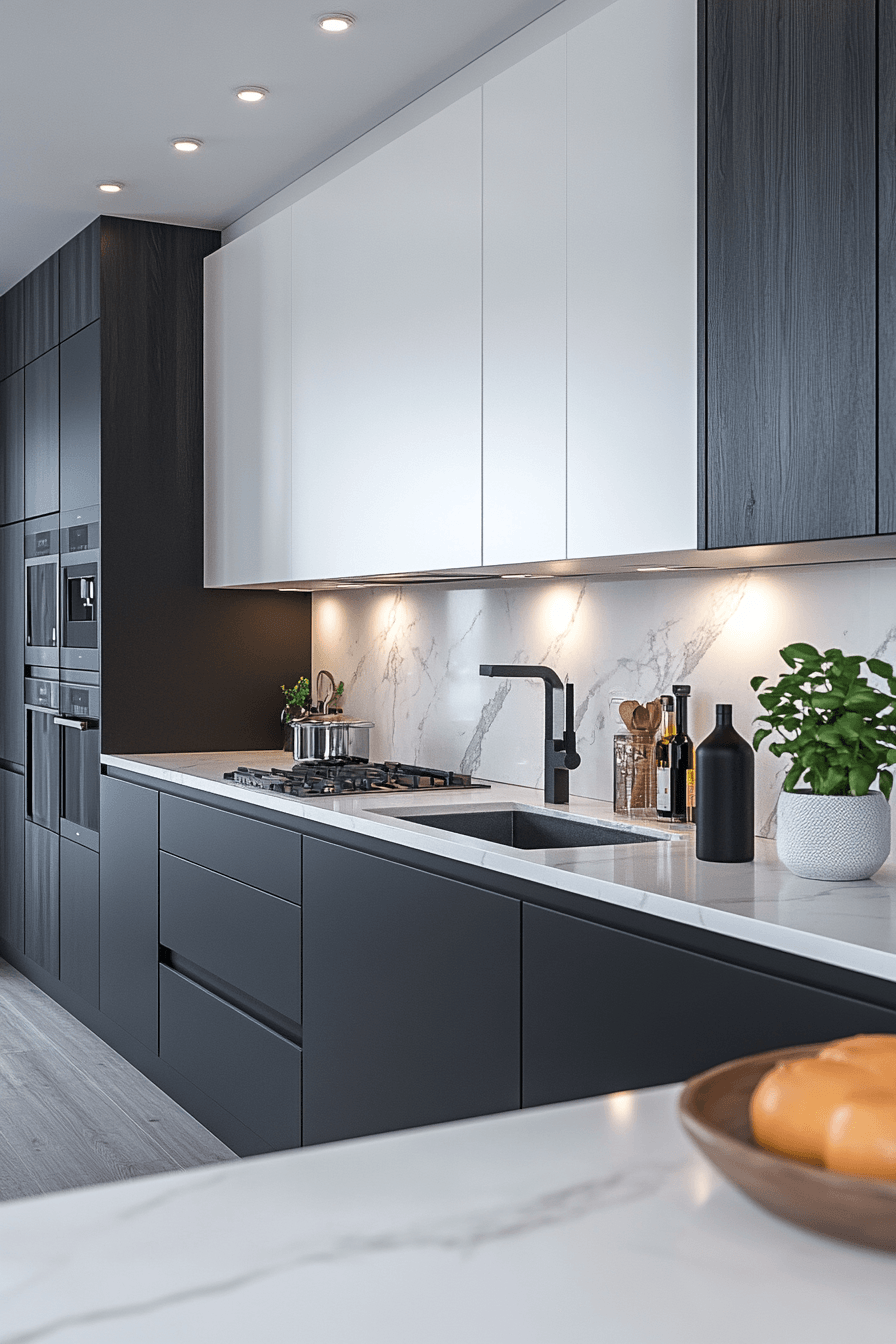 Bold black and white contrasts define a modern minimalist kitchen by creating a striking visual balance that feels both dramatic and refined without overwhelming the space. Clean lines maintain structure. Minimal hardware enhances the aesthetic. Lighting softens the contrast effectively. The design feels cohesive and timeless. Explore how monochrome palettes enhance kitchens.