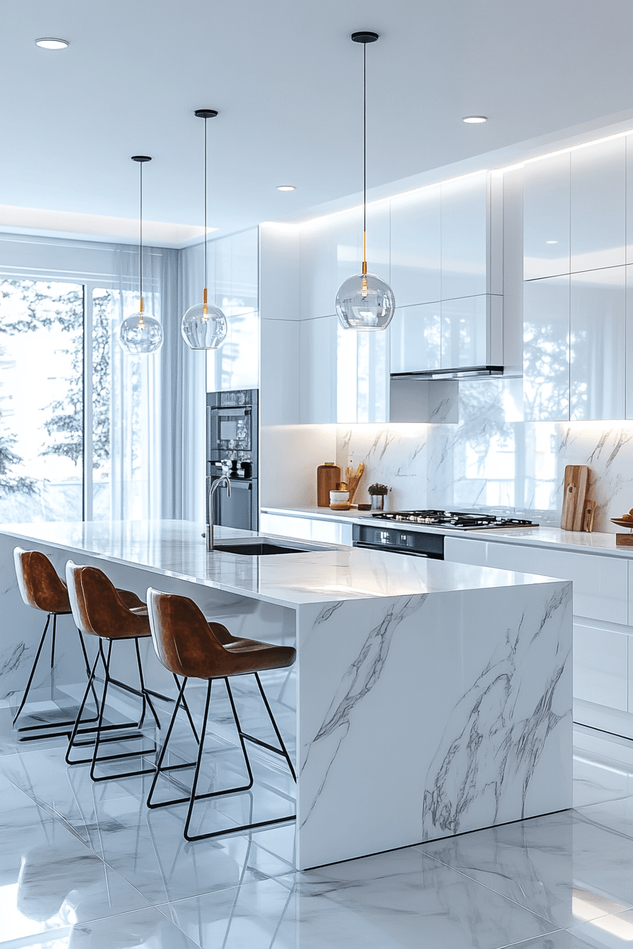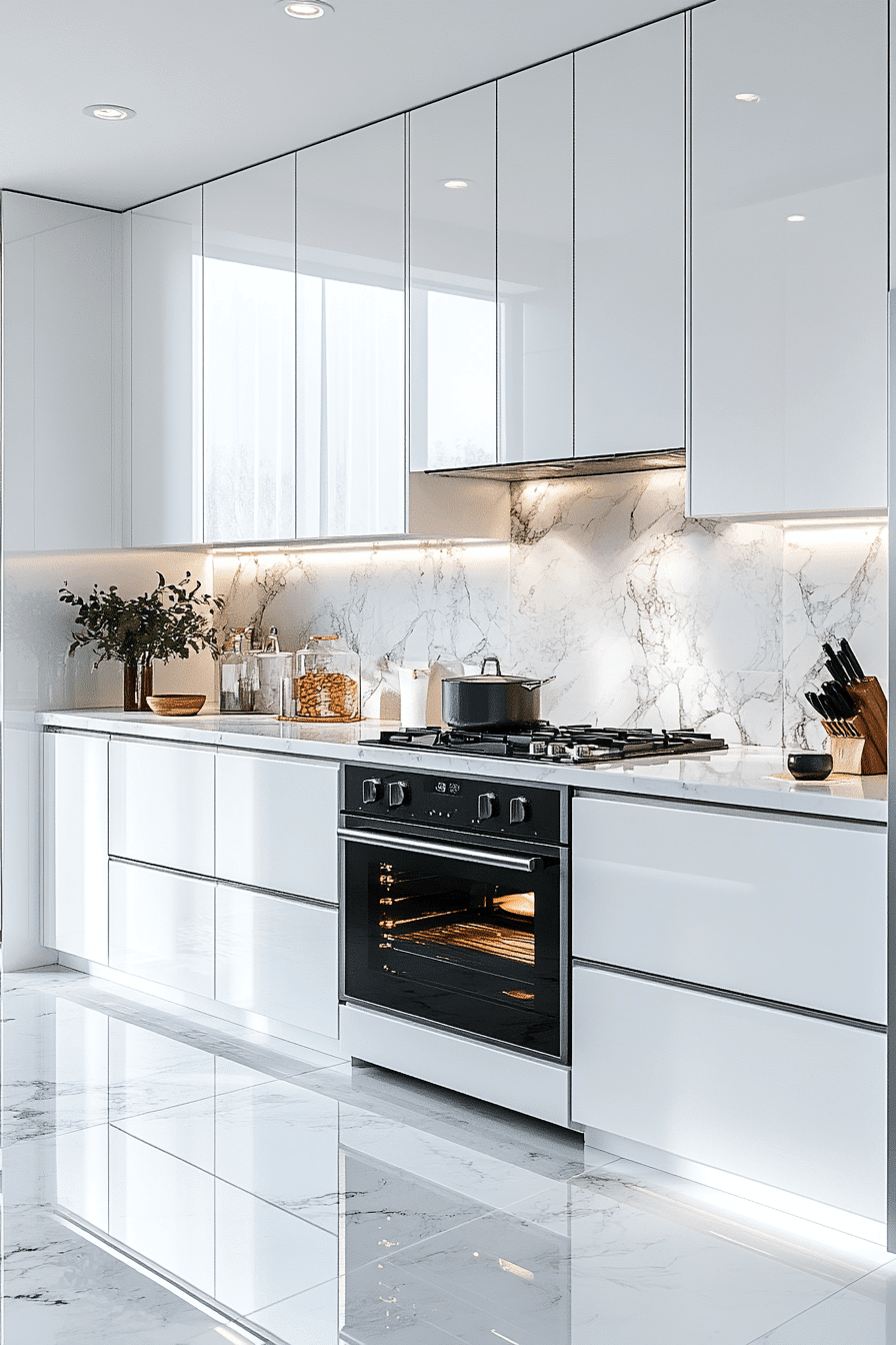Reflective white surfaces enhance a modern minimalist kitchen by amplifying natural light and creating a bright, open environment that feels clean and timeless across various layouts. Streamlined appliances blend seamlessly into the design. Minimal accents maintain purity. The aesthetic feels fresh and sophisticated. The space remains visually expansive. Discover how reflective finishes improve kitchens.