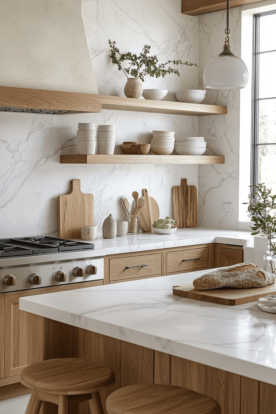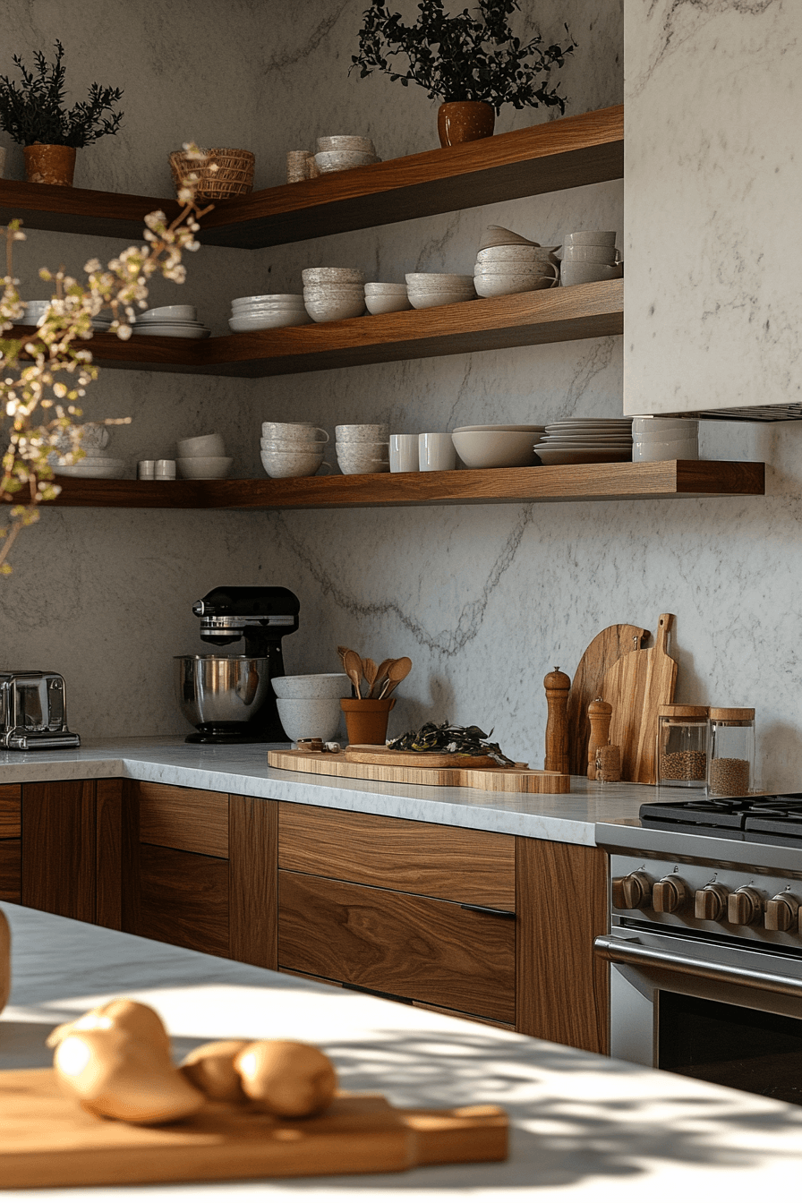 Open shelving introduces personality into a modern minimalist kitchen by displaying essentials while maintaining a clean and airy aesthetic that feels both practical and visually appealing. Floating shelves add structure without heaviness. Neutral finishes maintain balance. The design feels curated yet simple. The space blends function and style. Discover how open shelving enhances kitchens.