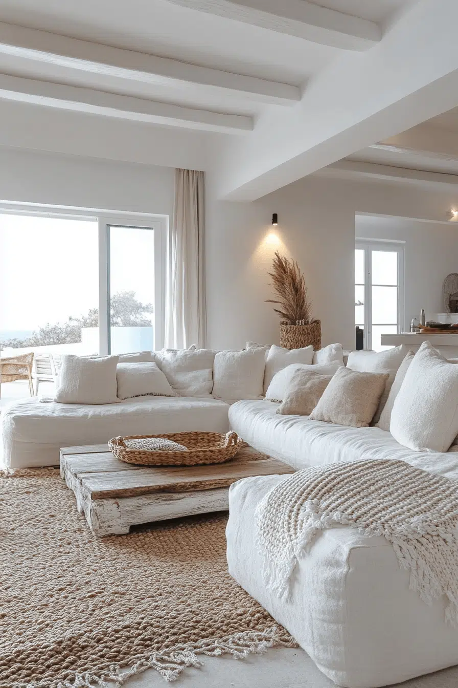 🚀 Pro Tip: Layer three tones of white—walls in pure white, upholstery in warm white linen, and throws in natural cream—to keep the monochromatic scheme from feeling flat.