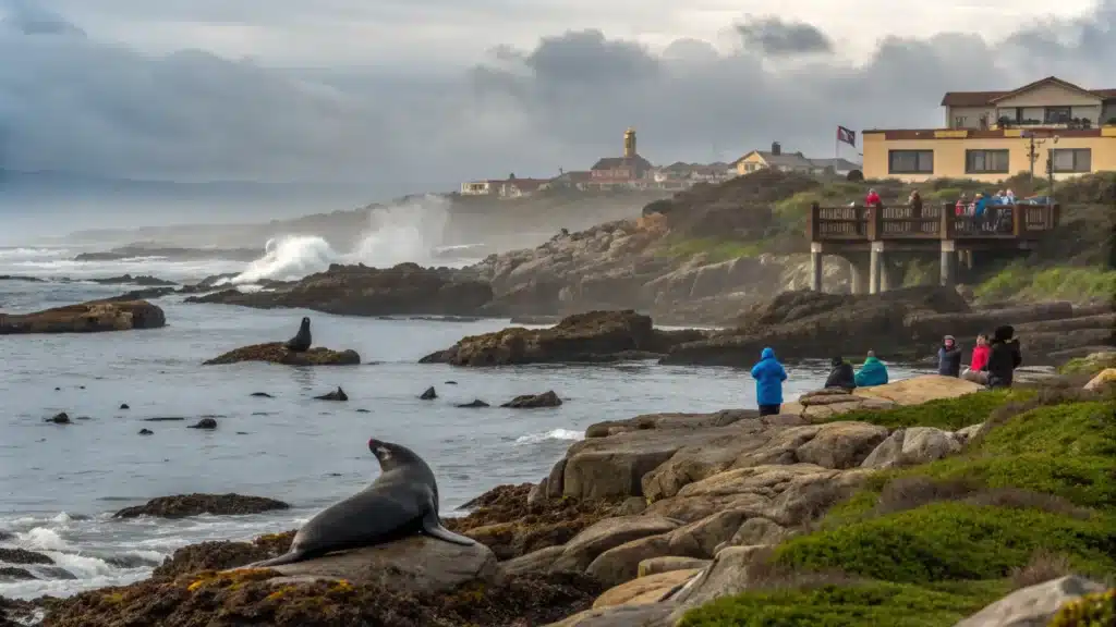 "Tourists at Monterey coastline viewing whales, seals, and an otter amidst foggy Cannery Row buildings under a moody spring sky during golden hour"