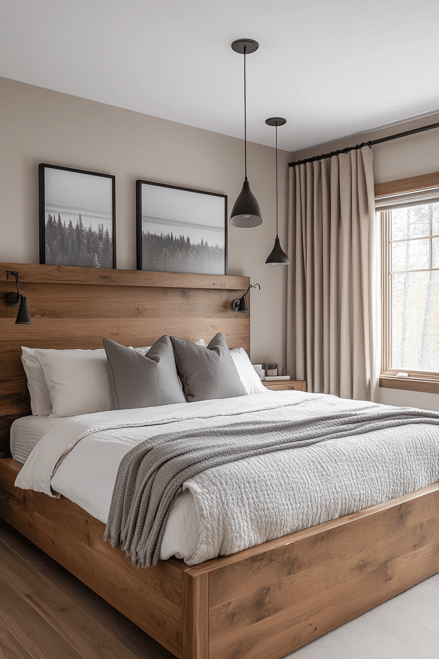 Pine furniture creates crisp and lively natural wood bedroom ideas with a bright Scandinavian edge. White walls and black accents contrast beautifully with the warm tones of pine. Clean-lined lighting and minimal artwork maintain the modern feel. Fresh greenery adds a vibrant touch to the design. The space feels energetic while still calming. Tap to refresh your bedroom with crisp pine style.