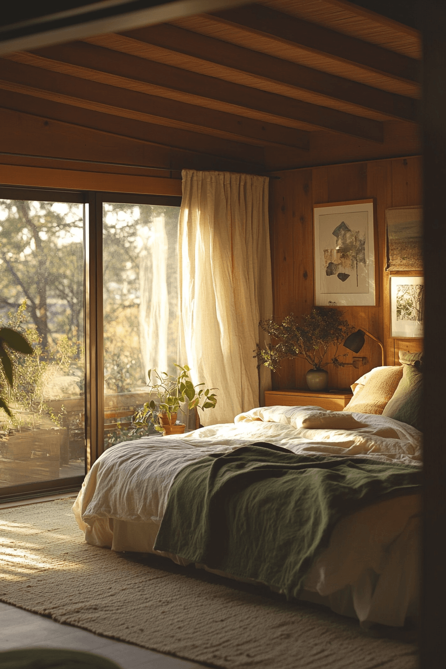 Nature-inspired palettes shape these flowing natural wood bedroom ideas that feel rich and grounded. Medium-toned woods such as walnut or cherry pair beautifully with greens, browns, and creamy neutrals. Live plants and stone details reinforce the outdoor influence. Low furniture profiles keep the room balanced and modern. Soft golden lighting enhances the natural warmth. Tap to create a bedroom that flows with forest-inspired energy.
